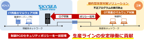 この度、「工場セキュリティソリューション」に「SKYSEA Client View」を組み合わせ、「制御システム脅威検知ソリューション」で収集した資産情報を取り込むことで、IT資産だけでなく工場内のOT資産を含む一括した資産管理を実現します。また、「SKYSEA Client View」から「標的型攻撃対策ソリューション」が導入されているすべての資産へポリシー設定を一括配信することで、セキュリティポリシーの徹底管理が可能となります。