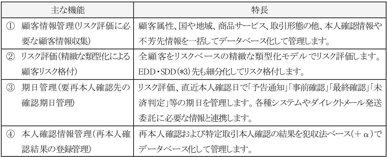全顧客に対する情報収集→リスク評価(格付)→本人確認期日管理→本人確認情報登録の一連の機能により、これまでのアンチマネーロンダリング対策システム(*2)ではできなかった一括管理を実現し、窓口や渉外活動、ダイレクトメール、ATMなど各種チャネルを活用した再本人確認作業を支援します。