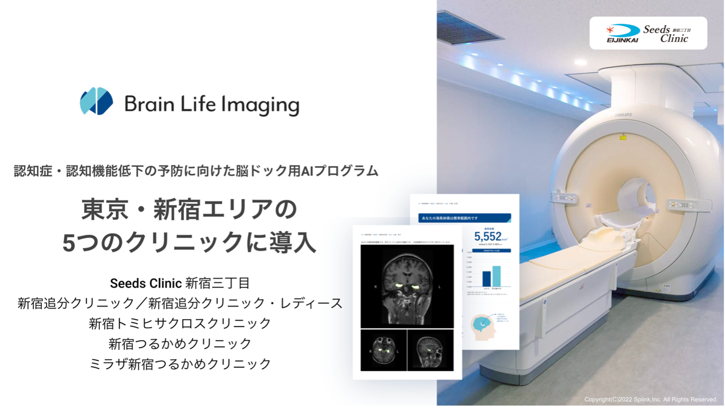 ブレインヘルスケア領域の医療AIスタートアップの株式会社Splink(本社:東京都千代田区、代表取締役:青山 裕紀、以下「Splink」)は、当社が開発・提供する脳ドック用AIプログラム「Brain Life Imaging®(ブレインライフイメージング)」(以下、Brain Life Imaging®)が医療法人永仁会 Seeds Clinic 新宿三丁目(所在地:東京都新宿区、院長:石田 二郎)など、東京・新宿エリアの5つのクリニックに導入しました。脳血管性リスクを検査する脳ドックが多い中で、同じエリア内で認知症・認知機能低下の予防に向けた脳ドックオプションサービスを複数導入することは異例となります。今回導入したクリニックにおいては、Brain Life Imaging®を活用した脳ドックサービス「脳ドックプラチナ」コースが受診可能となっています。
