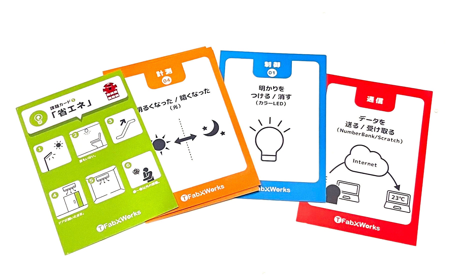 「アイディア出しで終りにするのではなく完成体験をさせてあげたい」「時間数が少ないから写経で終わりにするのではなく、少ない時間でも多彩な作品が生まれる授業を」という思いから、出来る事(計測・制御・通信)をカードにした「シンキングカード」を用意しました。