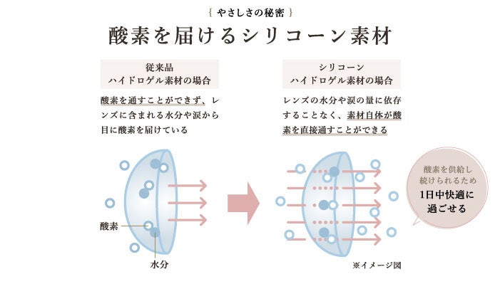 シリコーンハイドロゲル素材は、素材自体が直接酸素を通すため一日中快適に過ごすことができます。
