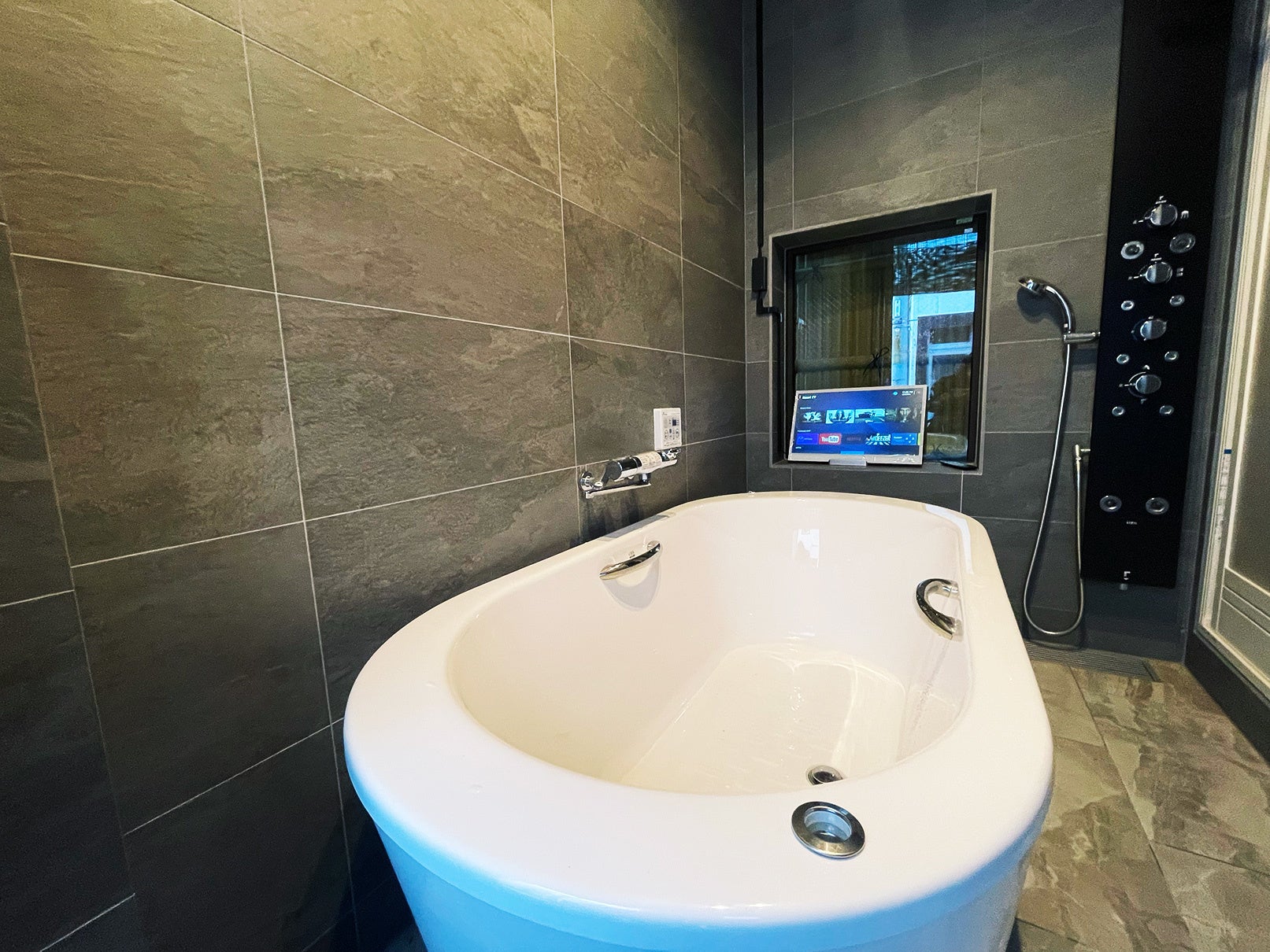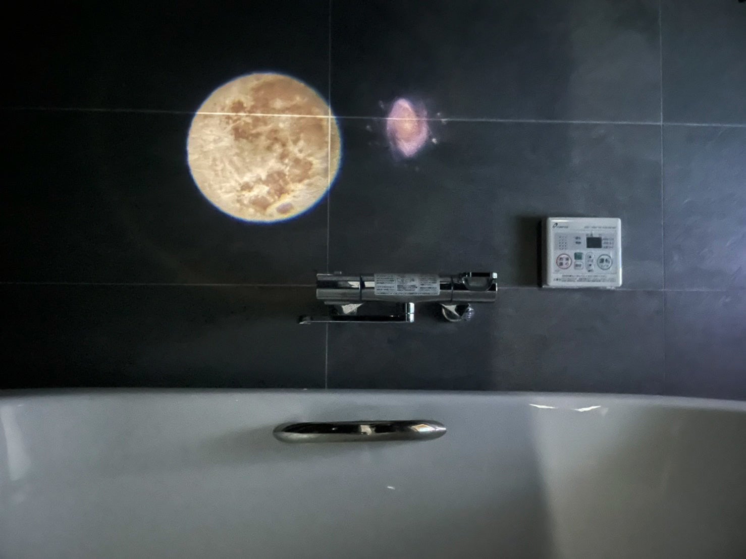 宇宙空間をイメージした浴室で、湯船につかりながら宇宙空間に漂うごとくリラックスしていただけます。また、22インチのモニターを備え付け、お風呂に入りながら映画等を鑑賞しながら、一日の疲れを癒していただけます。