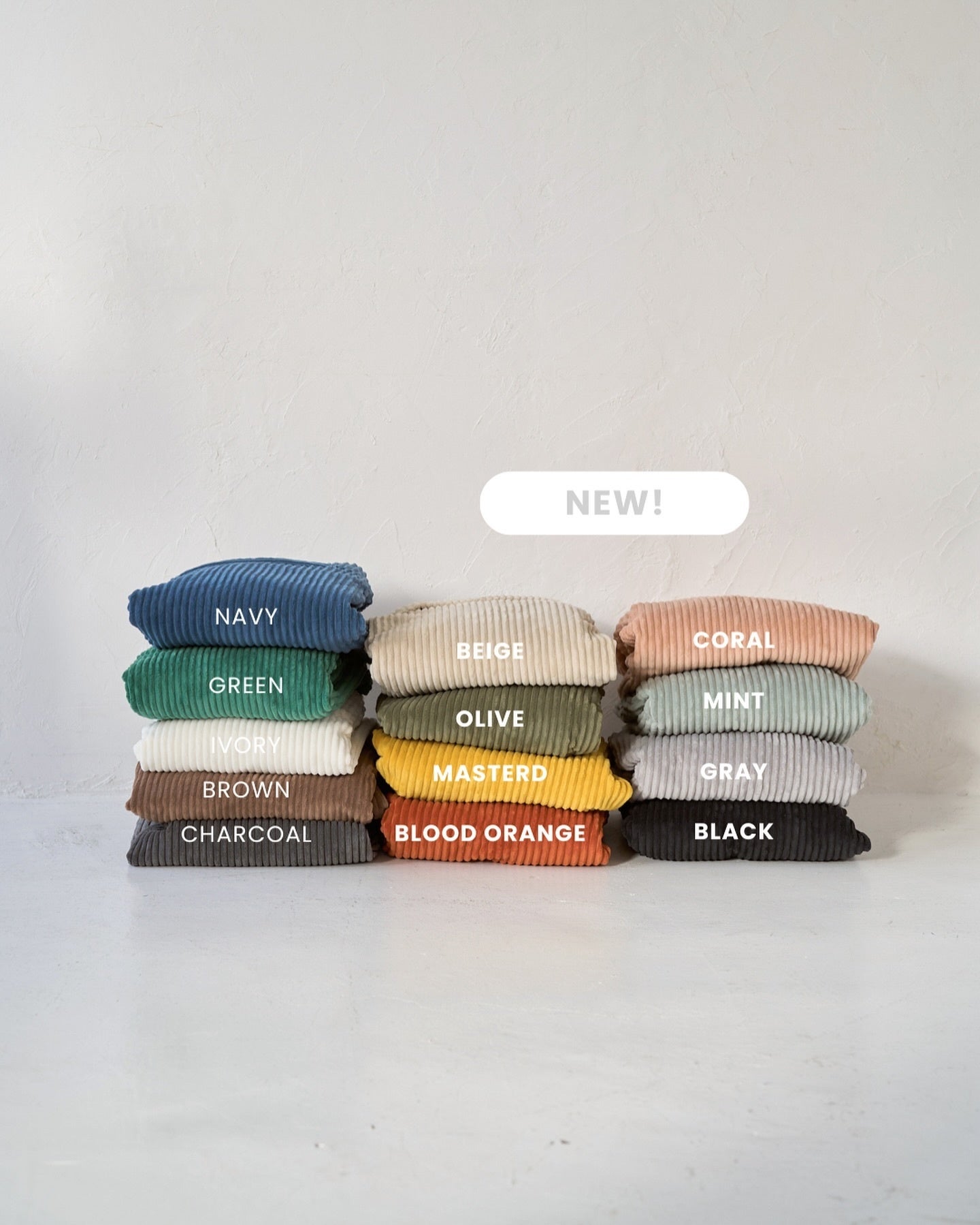 お客様からの声をもとに企画した新色のコーデュロイ8色に加え、既存のコーデュロイ5色・フェイクレザー3色の合計16色をラインナップ。お部屋のワンポイントになる色からベーシックな色まで、さまざまなカラーから自身の好みに合わせてお選びいただけます。