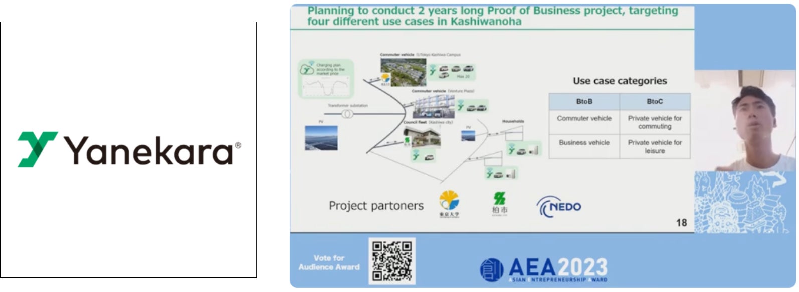 更に本年新たに創設された柏の葉スマートシティにおける事業実証のサポートが受けられる「柏の葉賞」は、「太陽光エネルギーでEVに電力を供給かつ蓄電可能な最先端の双方向EV充電器とEVの充放電タイミングを制御するクラウドソフトウェア」を開発する、柏の葉に拠点を置く日本のスタートアップ、Yanekara Inc.が受賞しました。