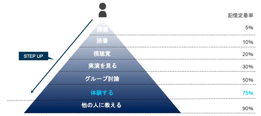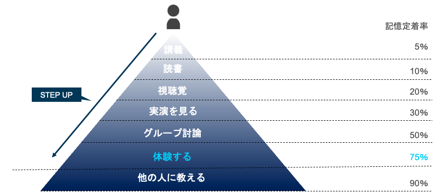 アメリカ国立訓練研究所の研究結果であるラーニングピラミッドの概念では、記憶定着率が「講義」だけでは10%程度であるのに対し「自らが体験する」と75%程度であることを明らかにしています。