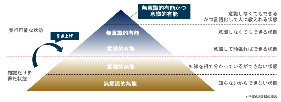 一番の特徴は講義だけでなく、要件定義や整理、示唆出しなどを実際に行っていただき「頑張れば行動可能なレベル」までナレッジを醸成することです。今回のソリューションではライトな課題をクリアしていただき体で覚え、達成の5段階の概念における実行可能な段階まで持っていくことを目的とします。