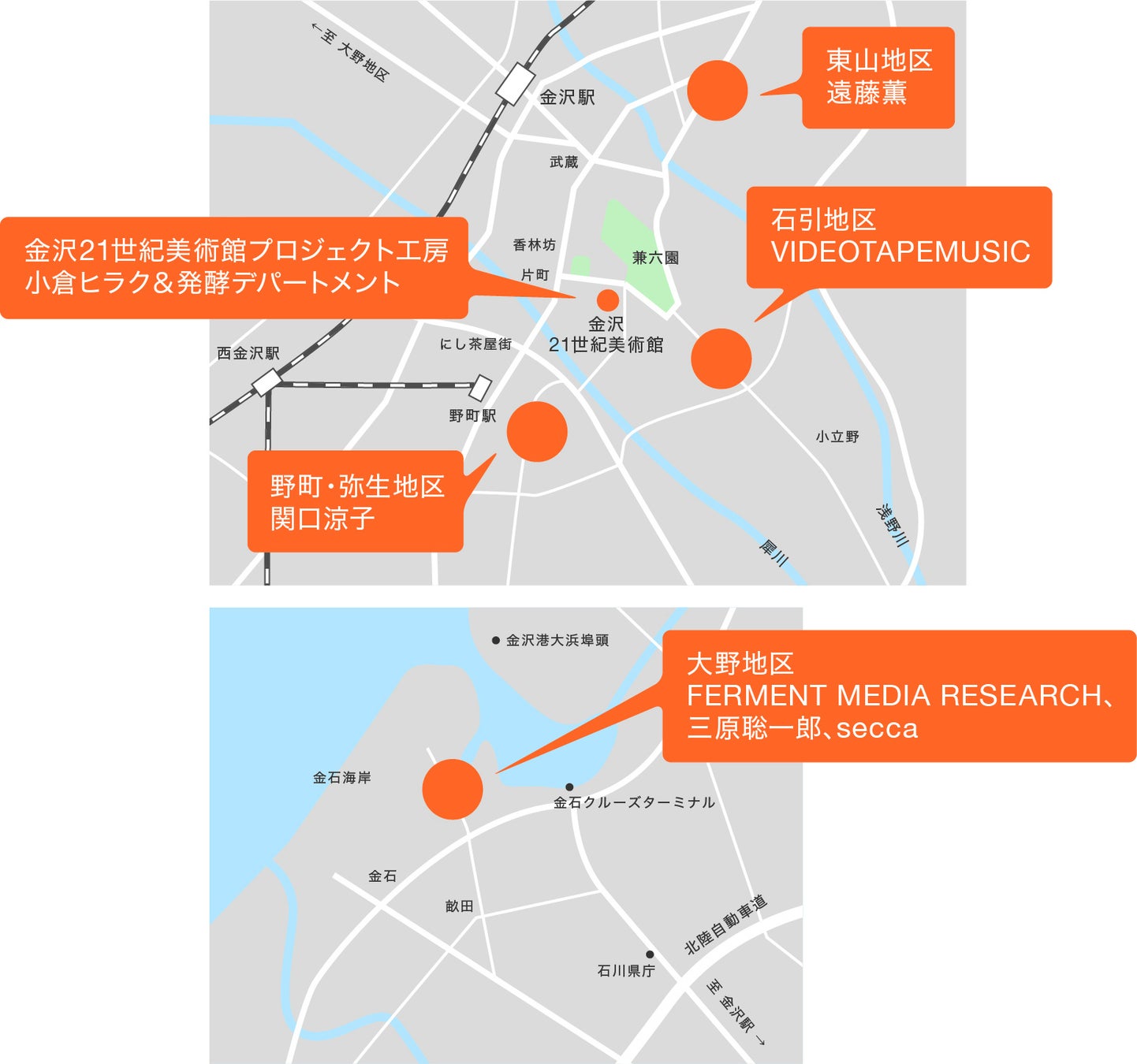 本プログラムは、石引地区、東山地区、野町・弥生地区、大野地区、白山市鶴来地区の5地区のスペースおよび金沢21世紀美術館プロジェクト工房、合計6エリアにて展開されます。