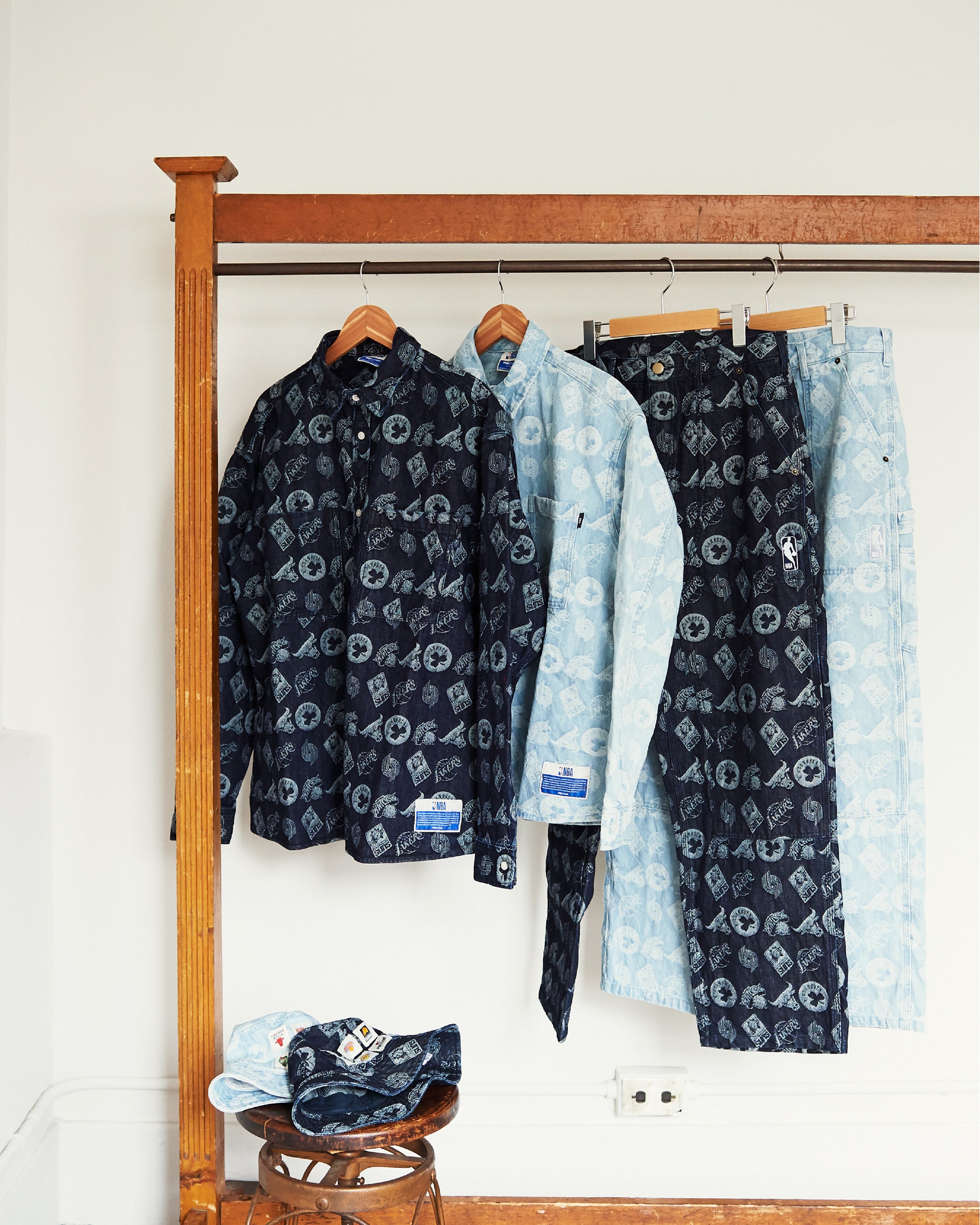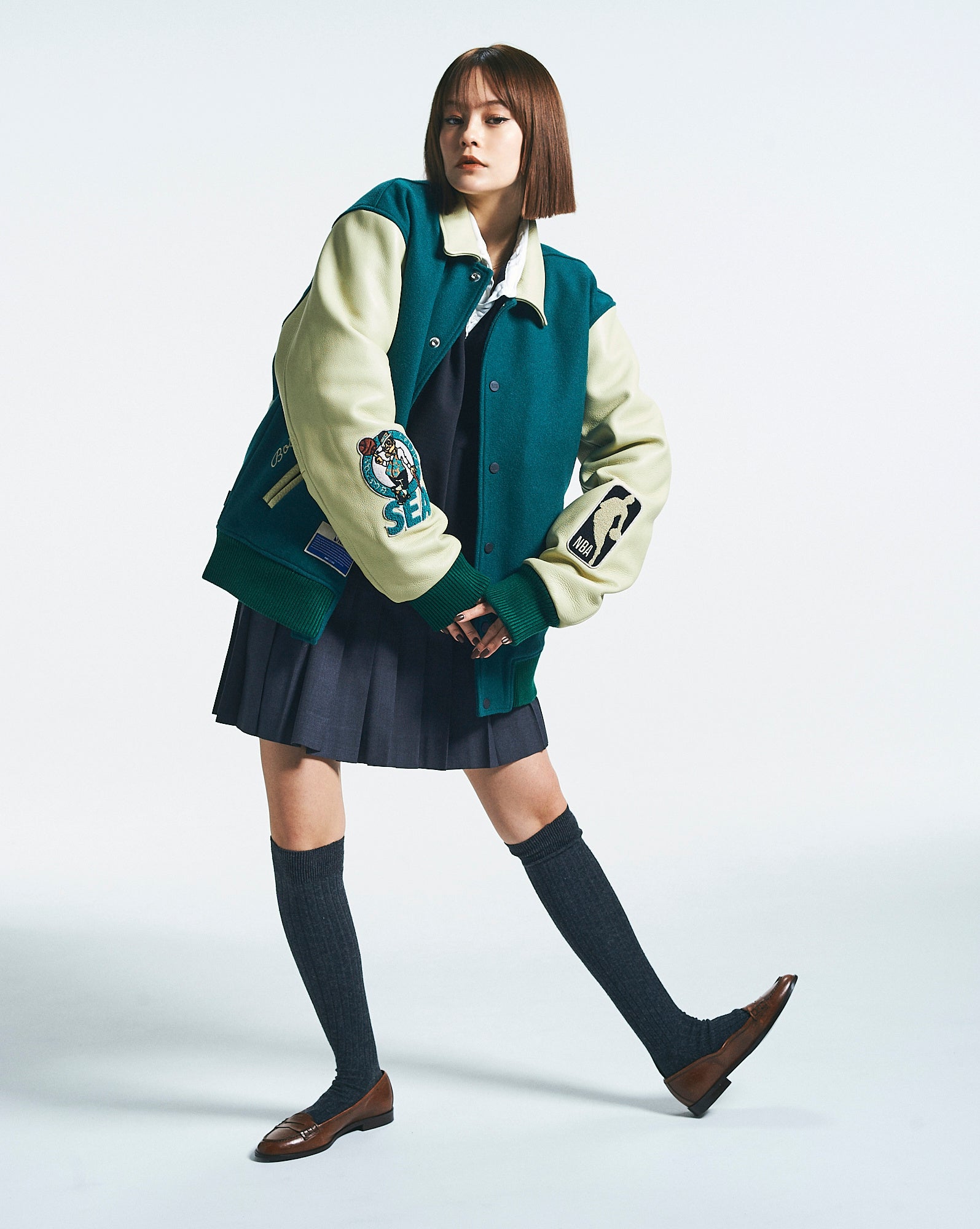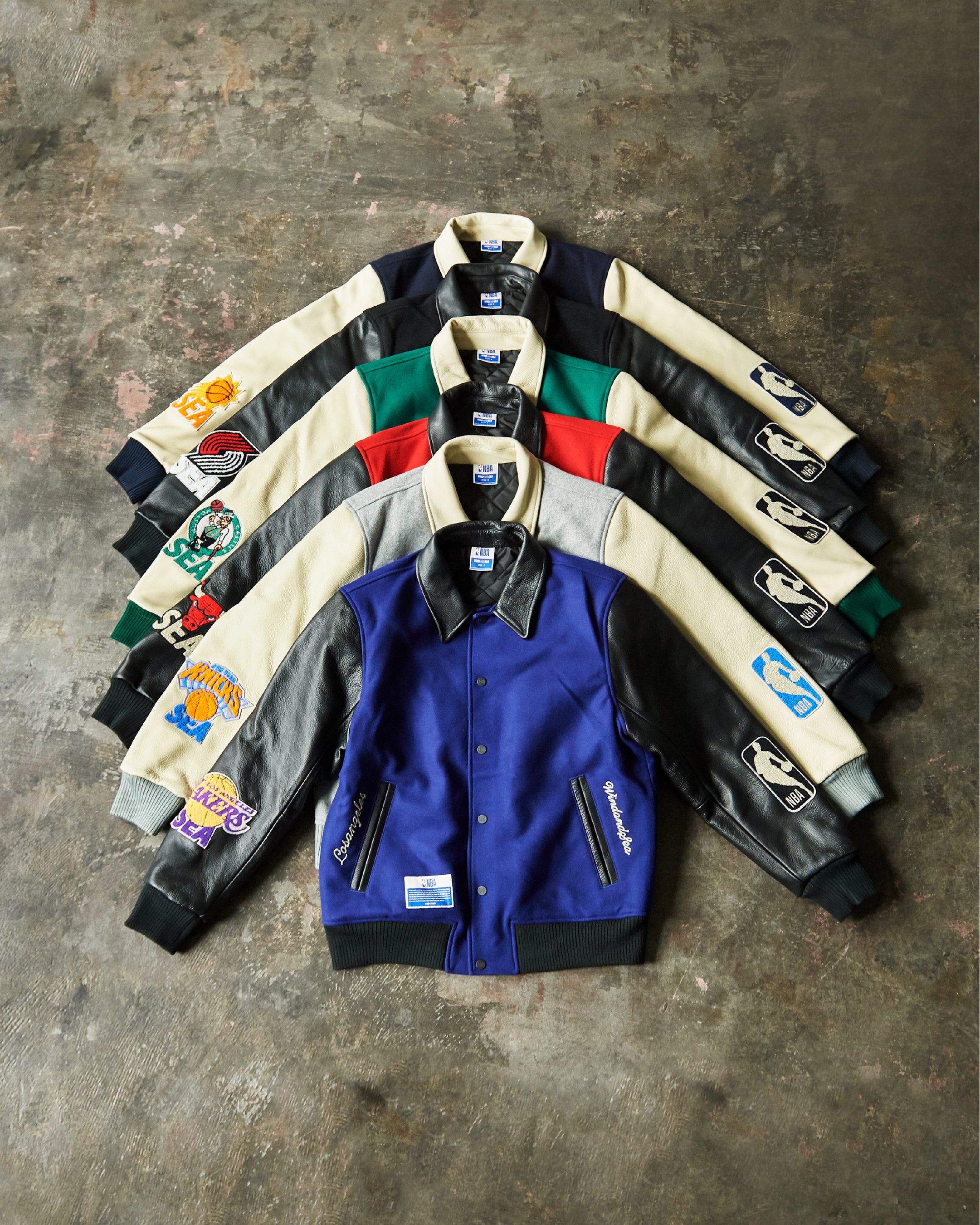 贅沢にカウレザーとメルトンでつくられたジャケットは、背⾯にチームの創⽴年が⼤胆にデザインオン。サイドフルスナップのスウェットパンツは、バスケットボールシューズの脱ぎ着に便利な仕様としてプレーウェアにも採⽤されている本格的なディテールをファッションアイテムに落とし込んだデザインに。他にも、6チームのチームインデックスが総柄でジャガードの織りによって表現されたデニムアイテムも登場します。