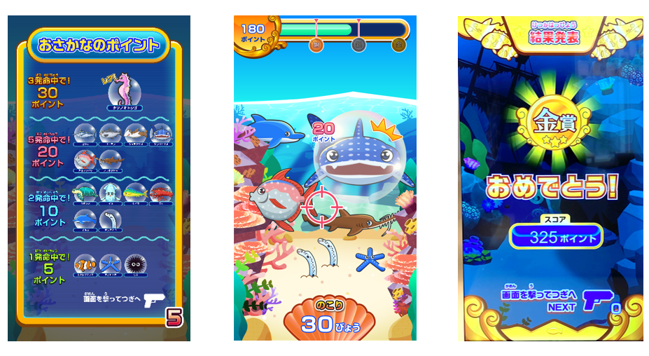 「ビッくらギョ!」は海を舞台にさまざまなお魚が登場するデジタル版射的ゲーム。