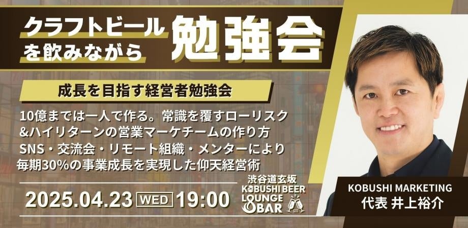 “人と人を繋ぐ”渋谷道玄坂『KOBUSHI BEER LOUNGE & BAR 』で、クラフトビールを飲みながら学べる勉強会を開催!4月23日(水)19:00~「毎期30%の事業成長を実現した経営術」
