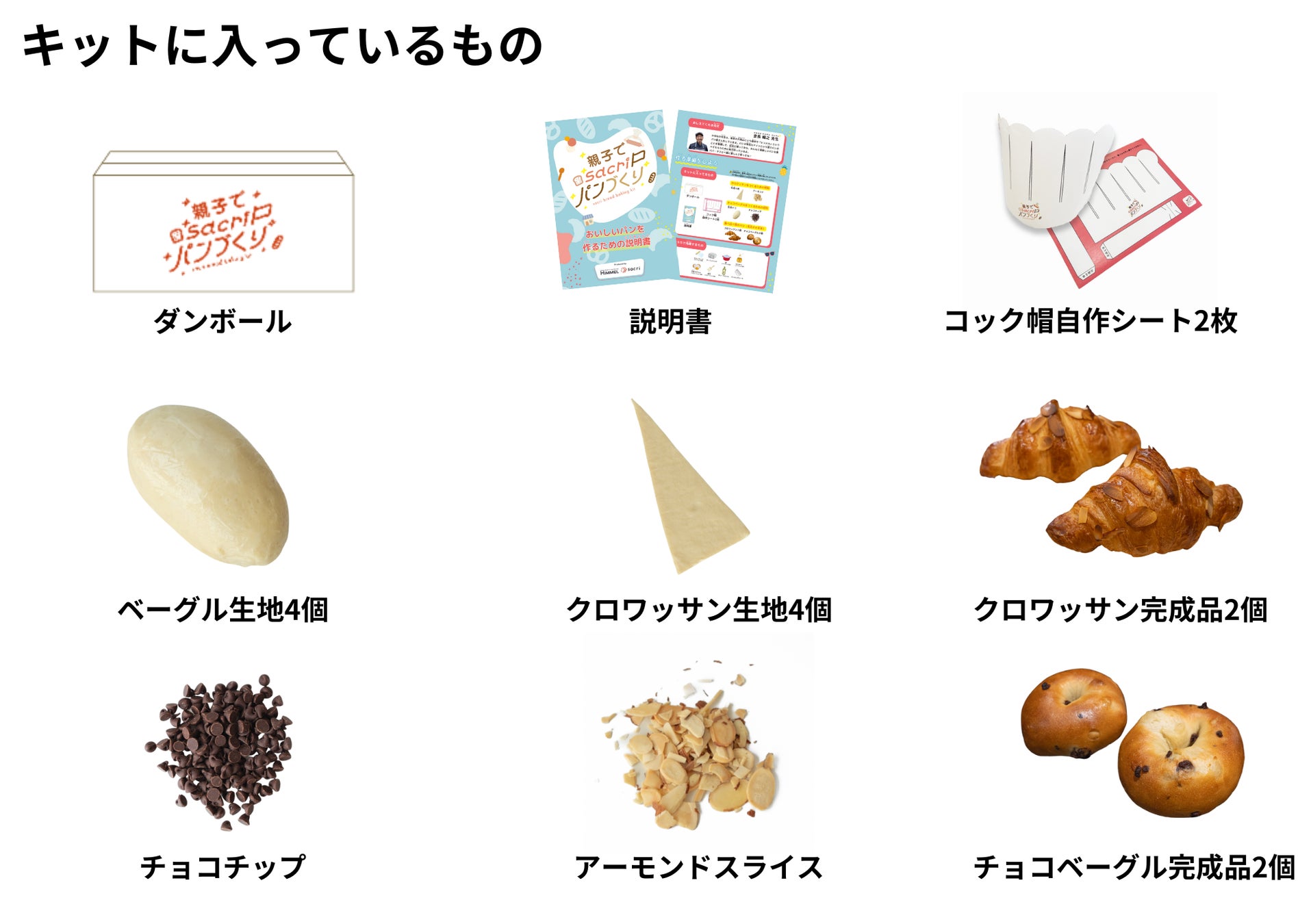 東京・大田区北千束にある人気店「ヒンメル」金長暢之シェフとのコラボによる親子パンづくりキット。ヒンメルで普段から使われている材料と今回のために考えられたレシピで、クロワッサン4つとチョコベーグル4つを作ることができます。また、食べ比べ用として同じ材料とレシピでシェフが作った完成品のパンも2個ずつ付きます。