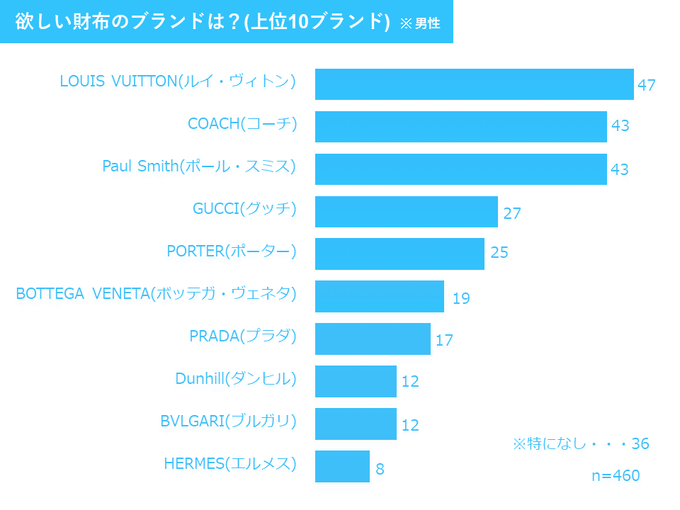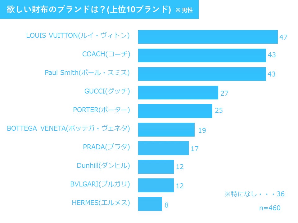 4番目に多い回答は「特になし 36票(男性の回答数の7.8%)」で、男女で比較すると男性の方がブランド物の財布に興味がないという回答が若干多い傾向となりました。
