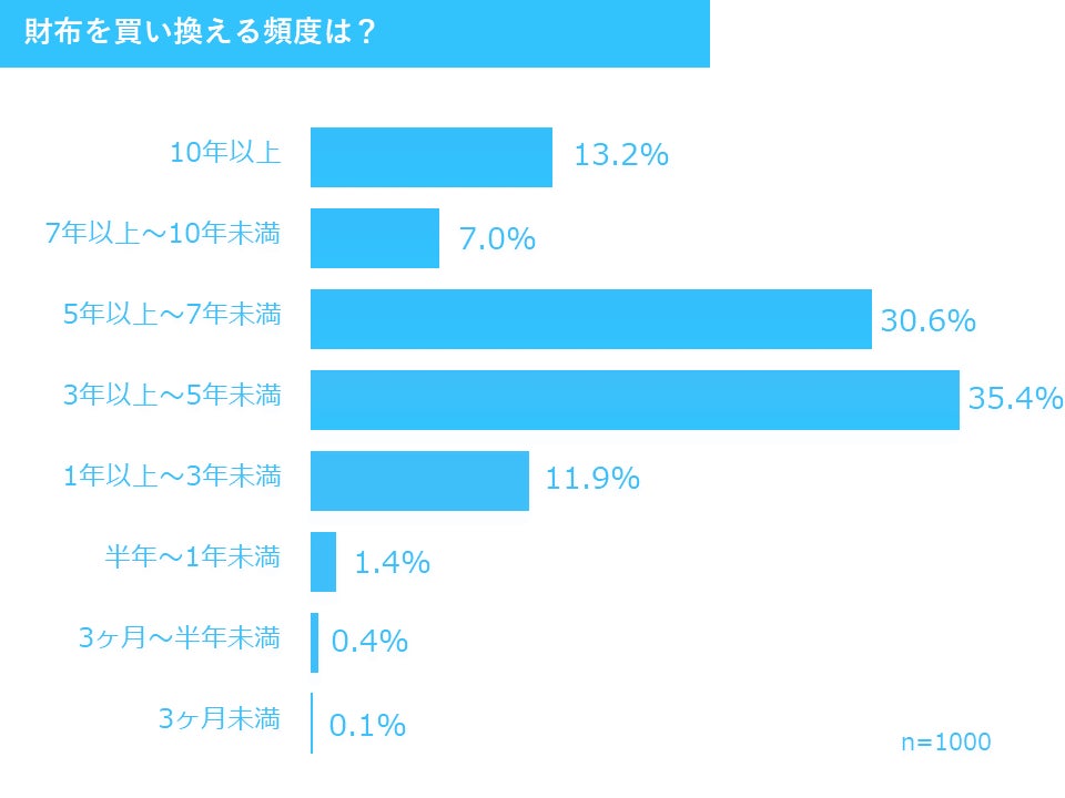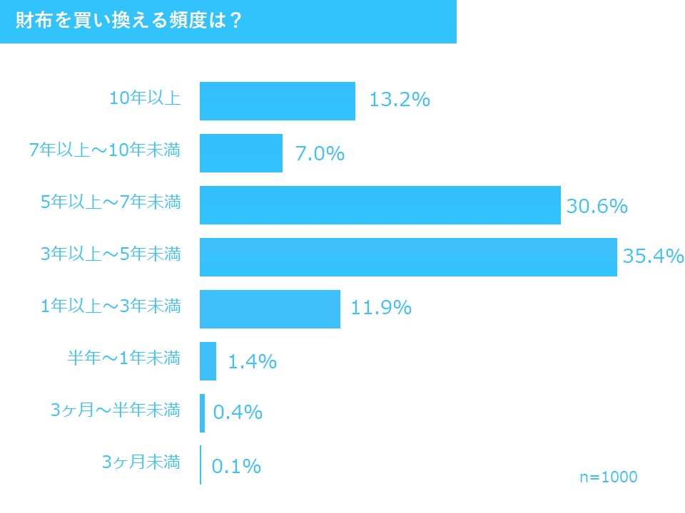 財布を買い換える頻度は、「3年以上から5年未満 35.4%」が最も多く、続いて「5年以上~7年未満 30.6%」となり、あまり頻繁には財布を買い換えなという結果になりました。