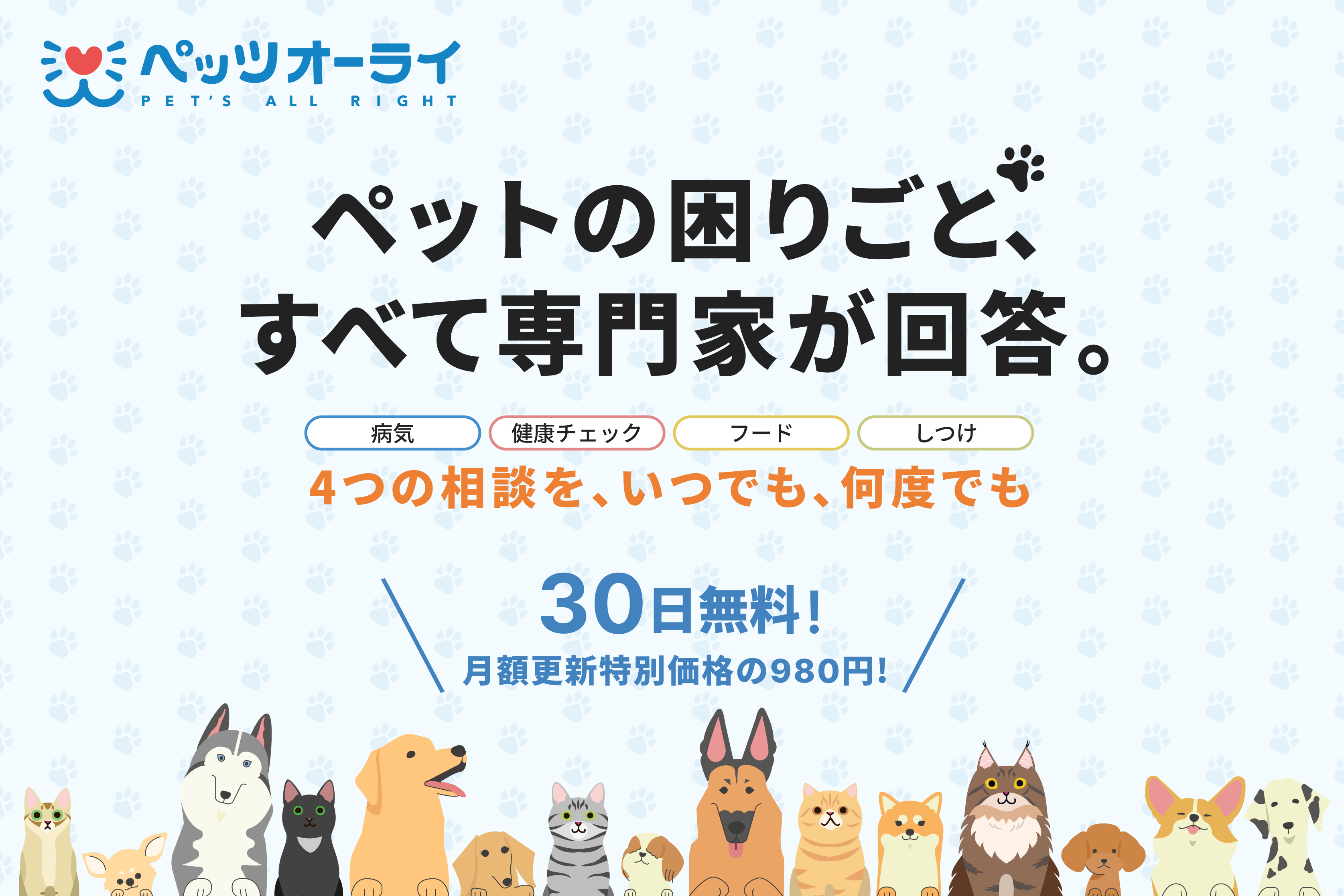 30日間無料で使い放題、その後の継続も特別価格で利用可能で、会員限定の特別優待等ペットと飼い主に嬉しい機能が満載です。
