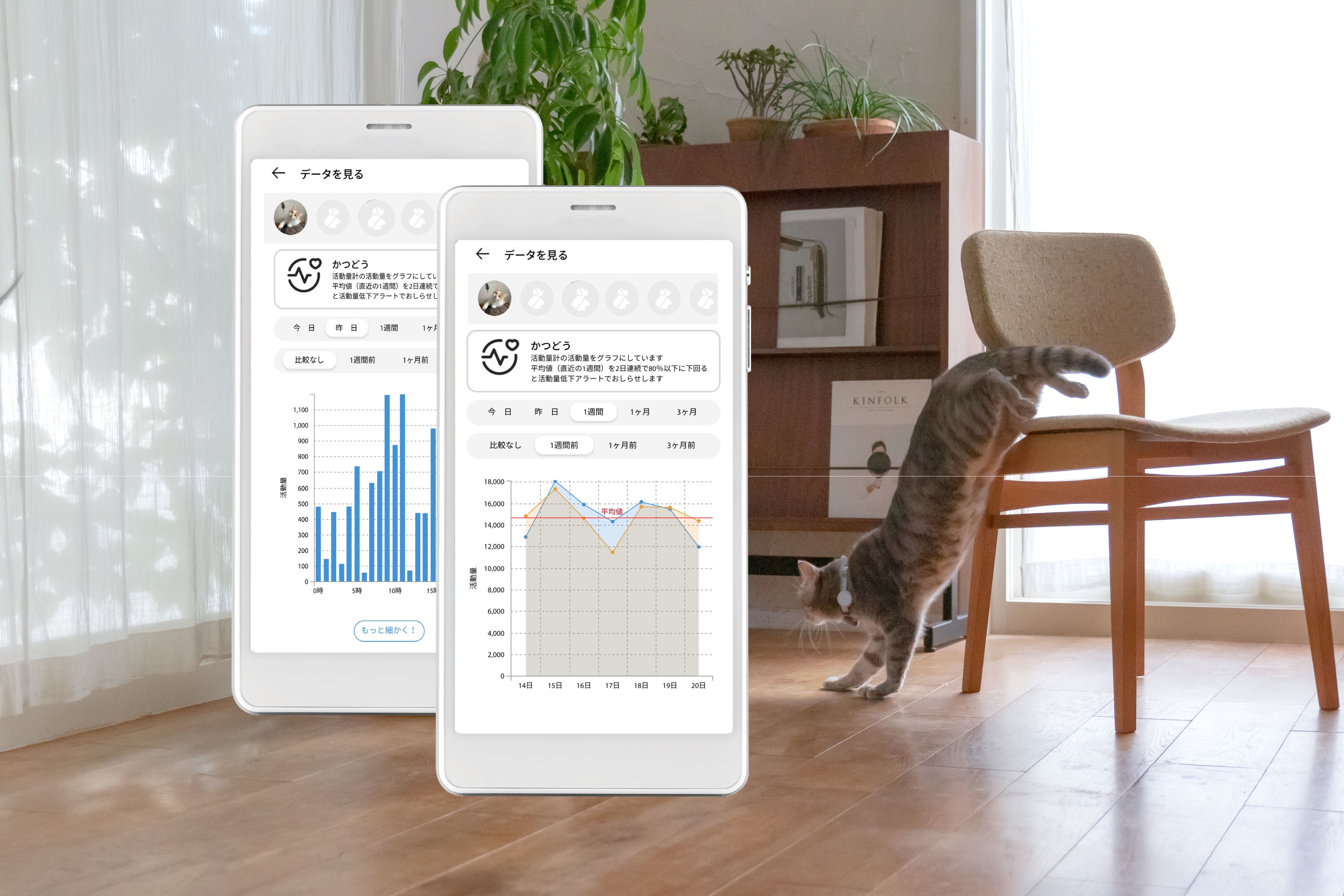 愛犬愛猫と同品種の平均値と比較することで、日々の活動量の目安となります。