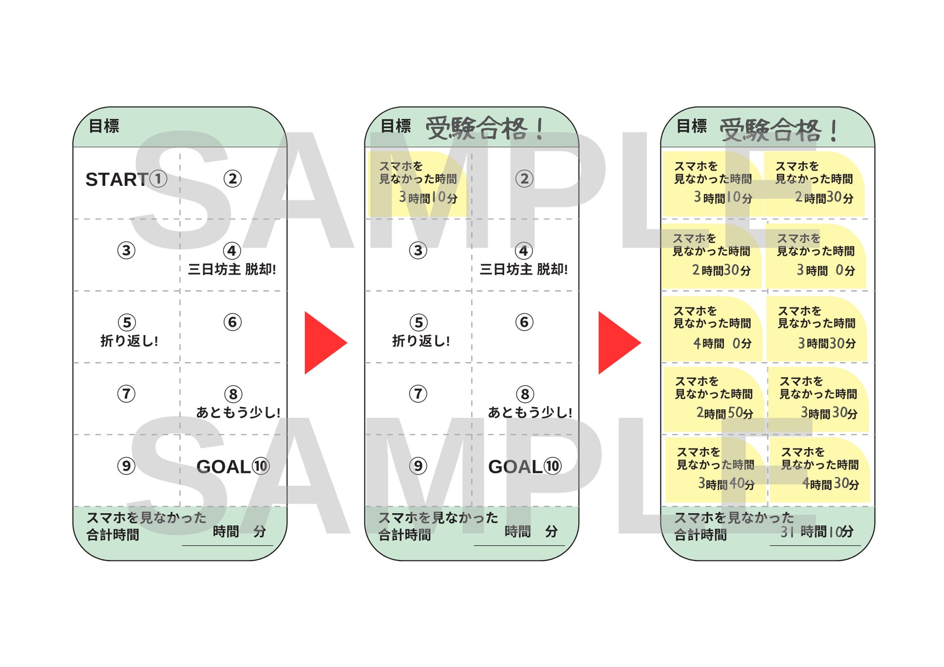 ノットタッチを使うたびに台紙を「スマホを見なかった時間」シールで埋めていき、10日間の合計時間を台紙下部の「スマホを見なかった合計時間」に記入します。