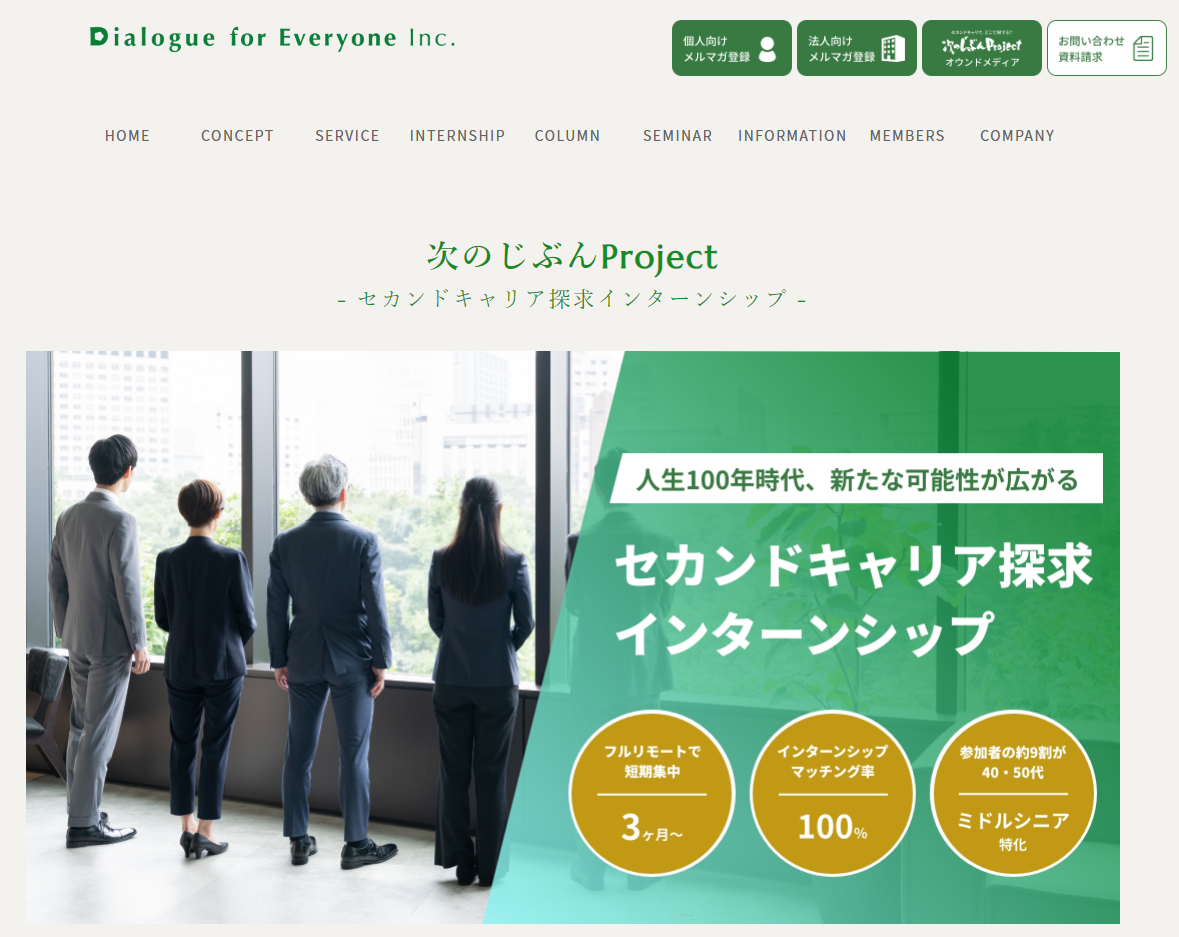 Dialogue for Everyone株式会社は、「コンフォートゾーンを越える」「思いもよらない展開を楽しむ」「年齢の枠を外し心のままに生きる」をパーパスに掲げ、都市部40代〜50代ミドルシニア社員を対象に、地方企業へのインターンシップ等の越境学習やキャリア講座等のプログラム提供を通じて、人生100年時代に、誰もが年齢にかかわりなく輝けるセカンドキャリア構築を支援します。
