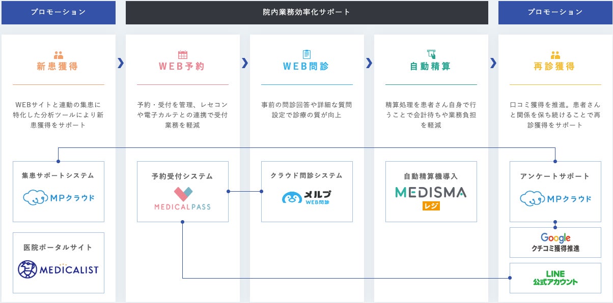 当社は、新しい診療所運営のスタンダードとして医療DXを活用したスマートクリニック構想を推進しております。当社では医療専門経営・広告管理クラウドシステム「MPクラウド」による広告効果だけではなく、経営分析や来院エリア分析といった、経営を安定させるための充実した機能や、時間予約機能「MEDICALPASS」やWEB問診機能「メルプ」、自動精算システム「MEDISMA-レジ」など受付業務効率の改善サービスが揃ったシステムを開発・提供し続けており、業界においてトップレベルのシェアを獲得してきました。