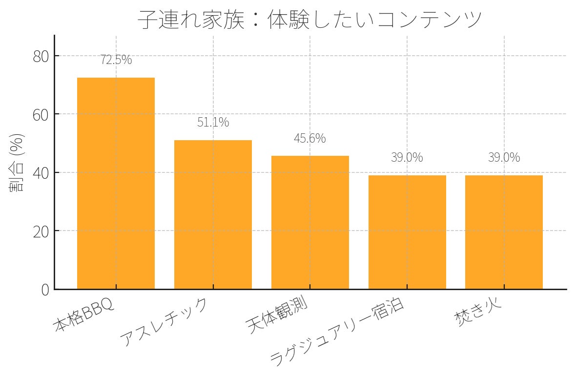 体験したいコンテンツとしては「本格BBQ」(72.5%)と「アスレチック・アクティビティ」(51.1%)が突出して高く、子どもが飽きない環境づくりが重要視されていることがわかります。また、「天体観測」(45.6%)や「ラグジュアリーな宿泊体験」「焚き火体験」(各39.0%)も人気があります。