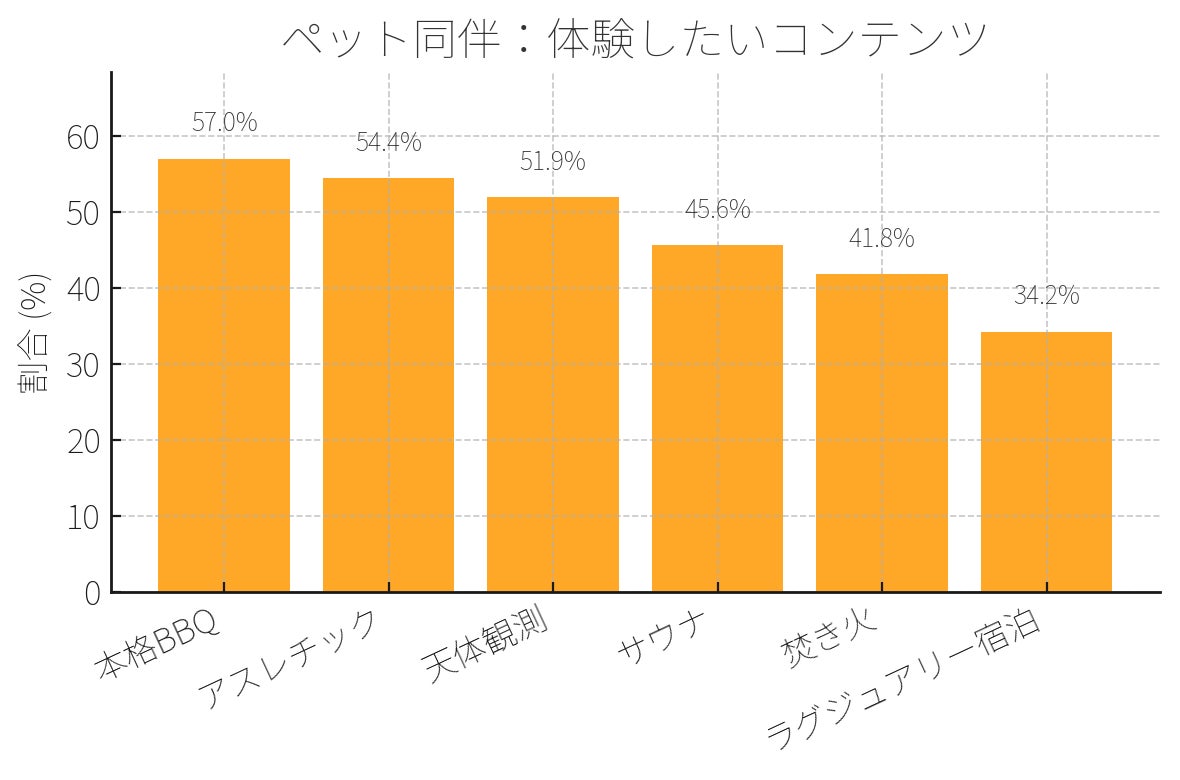 体験したいコンテンツとしては「本格BBQ」(57.0%)、「アスレチック・アクティビティ」(54.4%)、「天体観測」(51.9%)、「サウナ体験」(45.6%)、「焚き火体験」(41.8%)、「ラグジュアリーな宿泊体験」(34.2%)となっています。特筆すべきは「あてはまるものはない」が0%であり、ペット同伴希望者がさまざまな体験に積極的であることがわかります。
