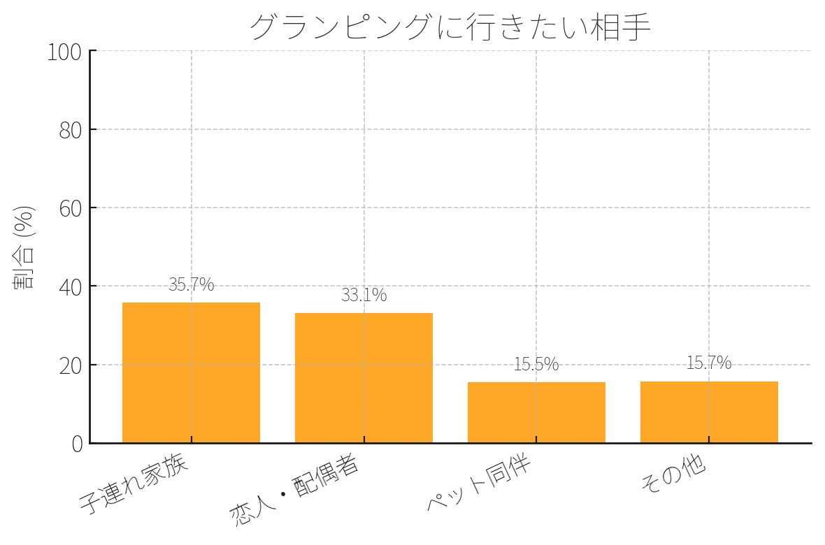 全国510人を対象に実施した今回の調査では、「グランピングに行くとしたら、誰と行きたいですか?」という質問(Q2)に対して、「子供連れ家族」が35.7%、「恋人・配偶者」が33.1%、「ペット(犬・猫など)」が15.5%という結果になりました(複数回答可)。