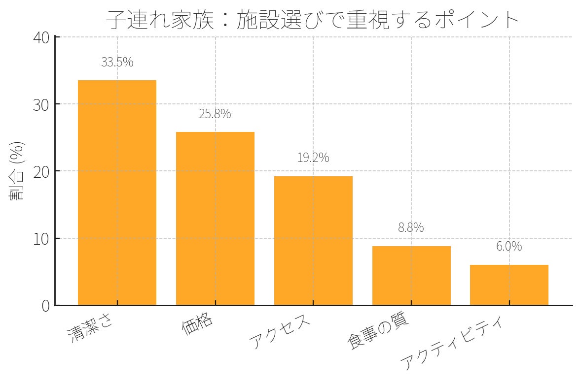 子連れ家族がグランピング施設を選ぶ際に最も重視するのは「施設の清潔さ・快適さ」(33.5%)で、次いで「価格」(25.8%)、「アクセスの良さ」(19.2%)と続きます。特筆すべきは「アクティビティの充実度」(6.0%)や「食事の質・バーベキュー体験」(8.8%)も一定の支持があり、子どもが楽しめる要素と食事の充実を重視する傾向があることです。