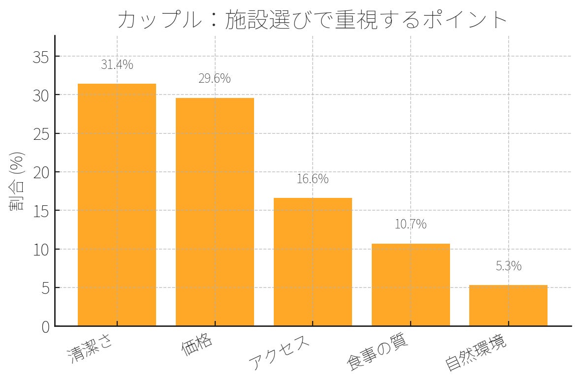 カップルがグランピング施設を選ぶ際に最も重視するのは「施設の清潔さ・快適さ」(31.4%)で、次いで「価格」(29.6%)、「アクセスの良さ」(16.6%)と続きます。特徴的なのは「食事の質・バーベキュー体験」(10.7%)や「自然環境・ロケーションの良さ」(5.3%)も重視されており、雰囲気や景観を大切にする傾向が見られることです。