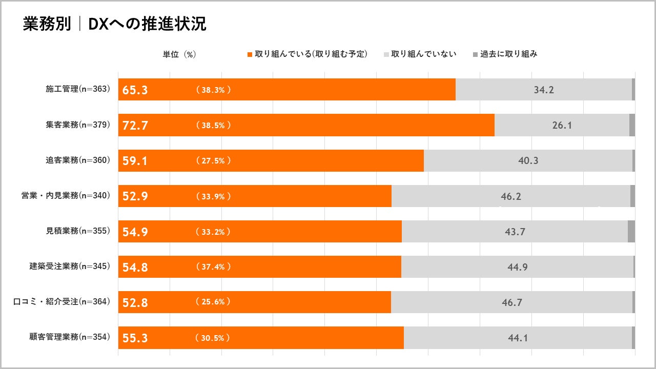 ◆ 具体的な業務別のDXへの推進状況は「集客業務」が最多で72.7%、次いで「施工管理」が65.3%