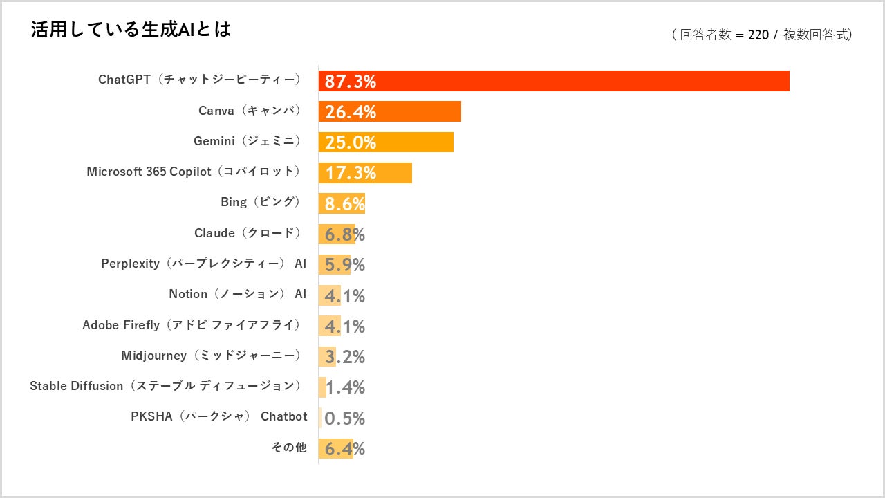 利用している生成AIは「ChatGPT」が87.3%で最多、「Canva」「Gemini」も25%以上が利用