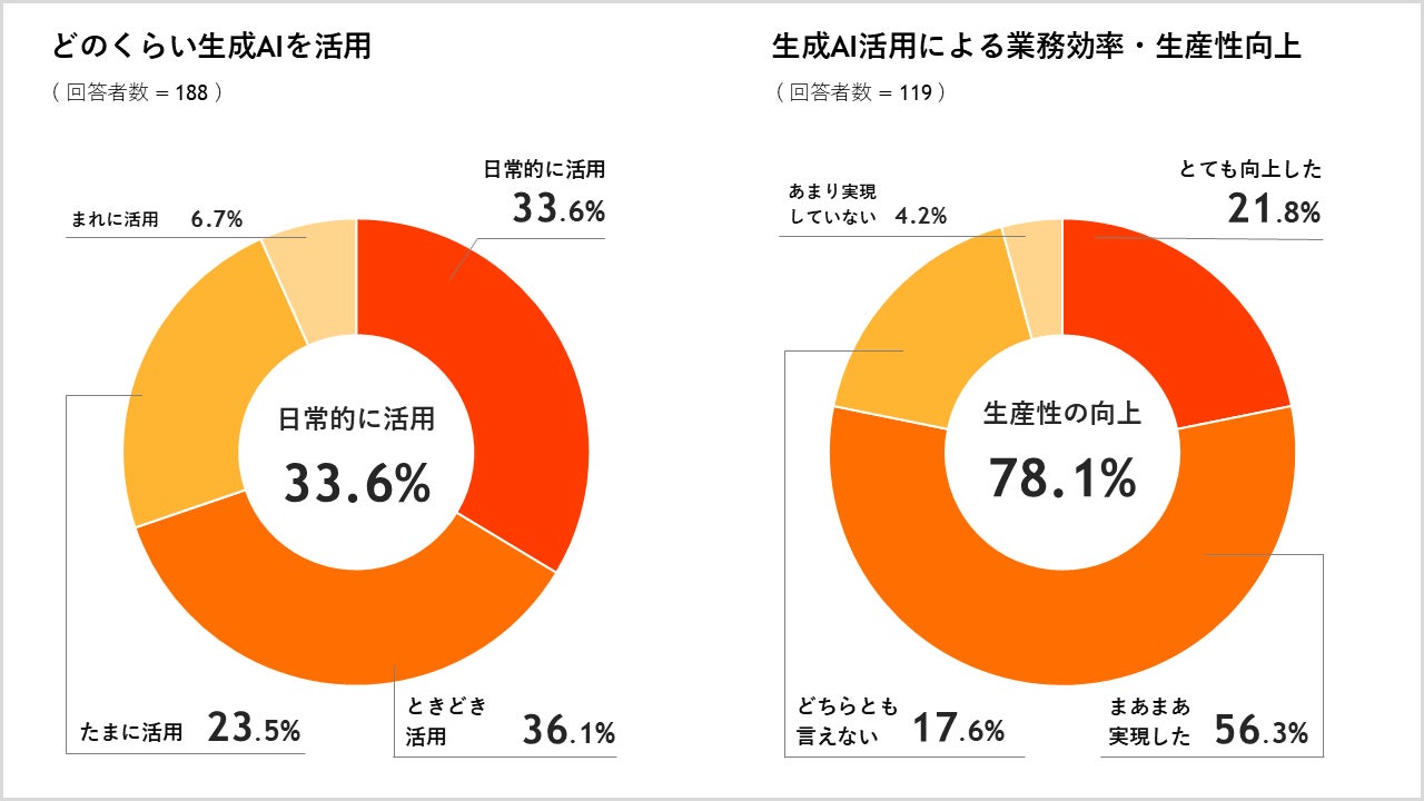 生成AIの活用頻度は「日常的に活用」が33.6%、生成AIの活用によって業務効率・生産性向上は「とても向上・まあまあ向上」が78.1%で多くの事業者が効果を実感