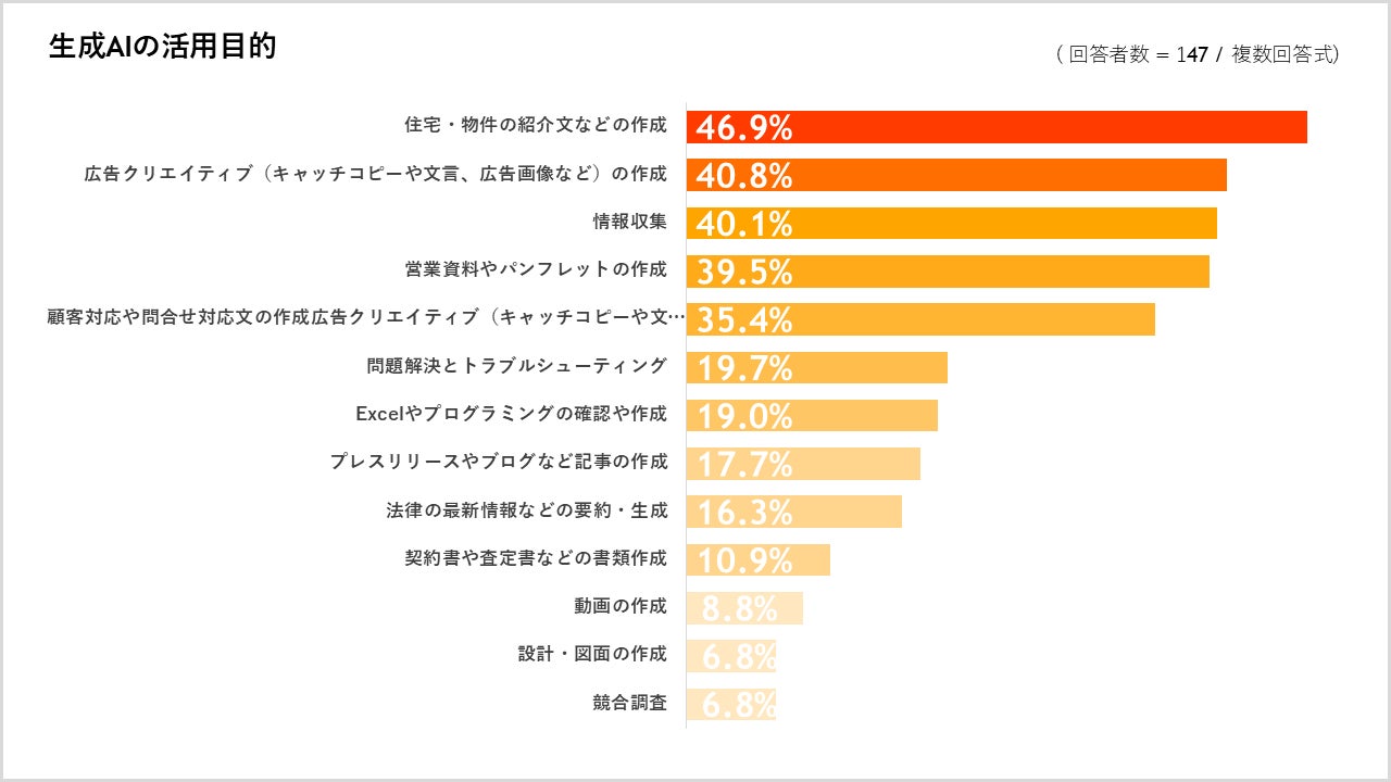 また、活⽤の⽬的は「住宅・物件の紹介⽂などの作成」「広告クリエイティブの作成」「情報収集」「情報収集」などが上位となりました。