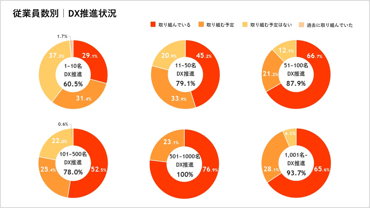 従業員数別のDX推進状況は「501-1,000名」で100%、「1-10名未満」も60.5%に -