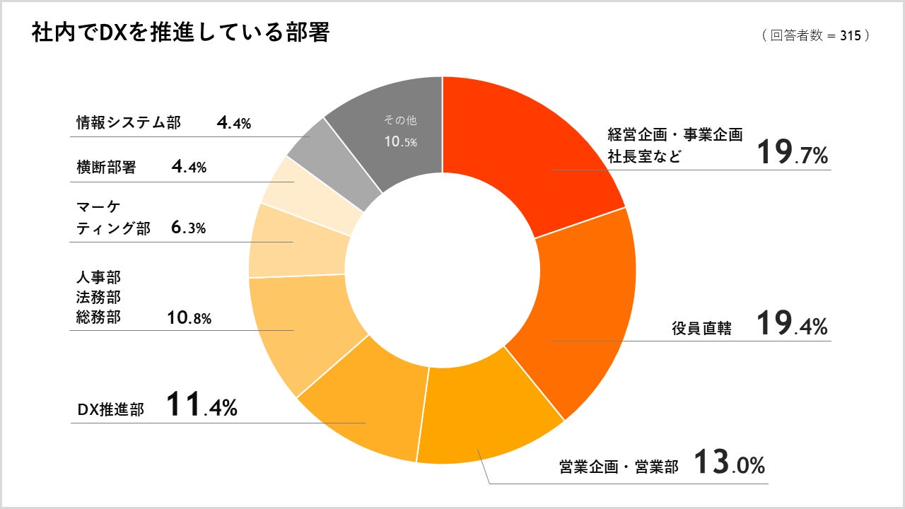 DX推進の担当部署について質問したところ、「経営企画・事業企画・社長室など」が最も多く19.7%で、次いで19.4%が「役員直轄」「営業企画・営業部」と回答しました。また「DX推進部」という専門部署が担当しているというケースも11.4%ありました。