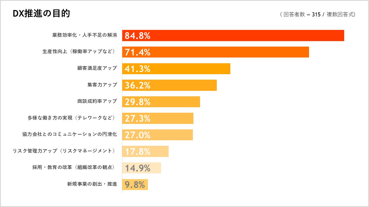 DX推進の目的について質問したところ、「業務効率化」が最も多く84.8%、次いで「生産性向上(稼働率アップなど)」が71.4%、顧客満足度アップが41.3%の回答となりました。