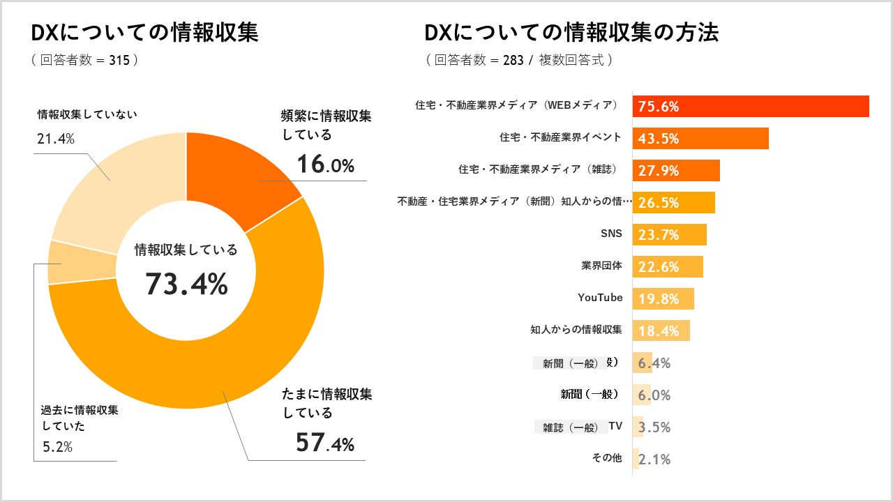 ◆ 住宅DXについて「頻繁に情報収集している」は16.0%、「たまに情報収集している」は57.4%、情報収集に最も活⽤されているのは「住宅・不動産業界メディア(WEB)」