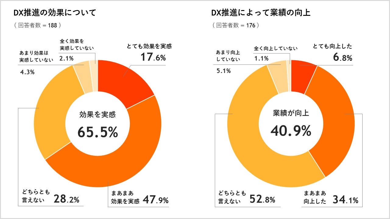 DXの効果について質問したところ、とても効果を実感している・まあまあ効果を実感している、をあわせると「効果を実感している」という回答が65.5%でした。同時に、DX推進によって業績が向上したかについても質問したところ、とても向上した・まあまあ向上した、を合わせると「業績が向上した」という回答は40.9%になりました。