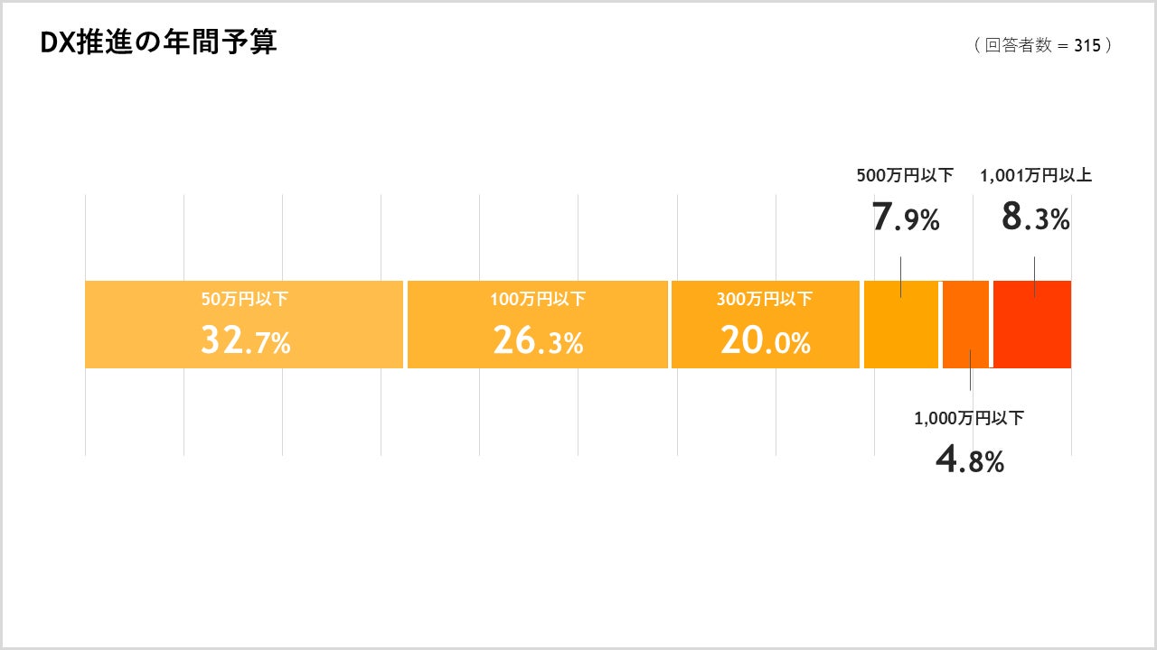 ◆ DX推進のための年間予算は従業員10名以下では「50万円以下」、11-50名以下では「100万円以下」、51-100名以下では「300万円以下」、101-500名以下では「300万円以下」、501名以上では「1,001万円以上」が最多