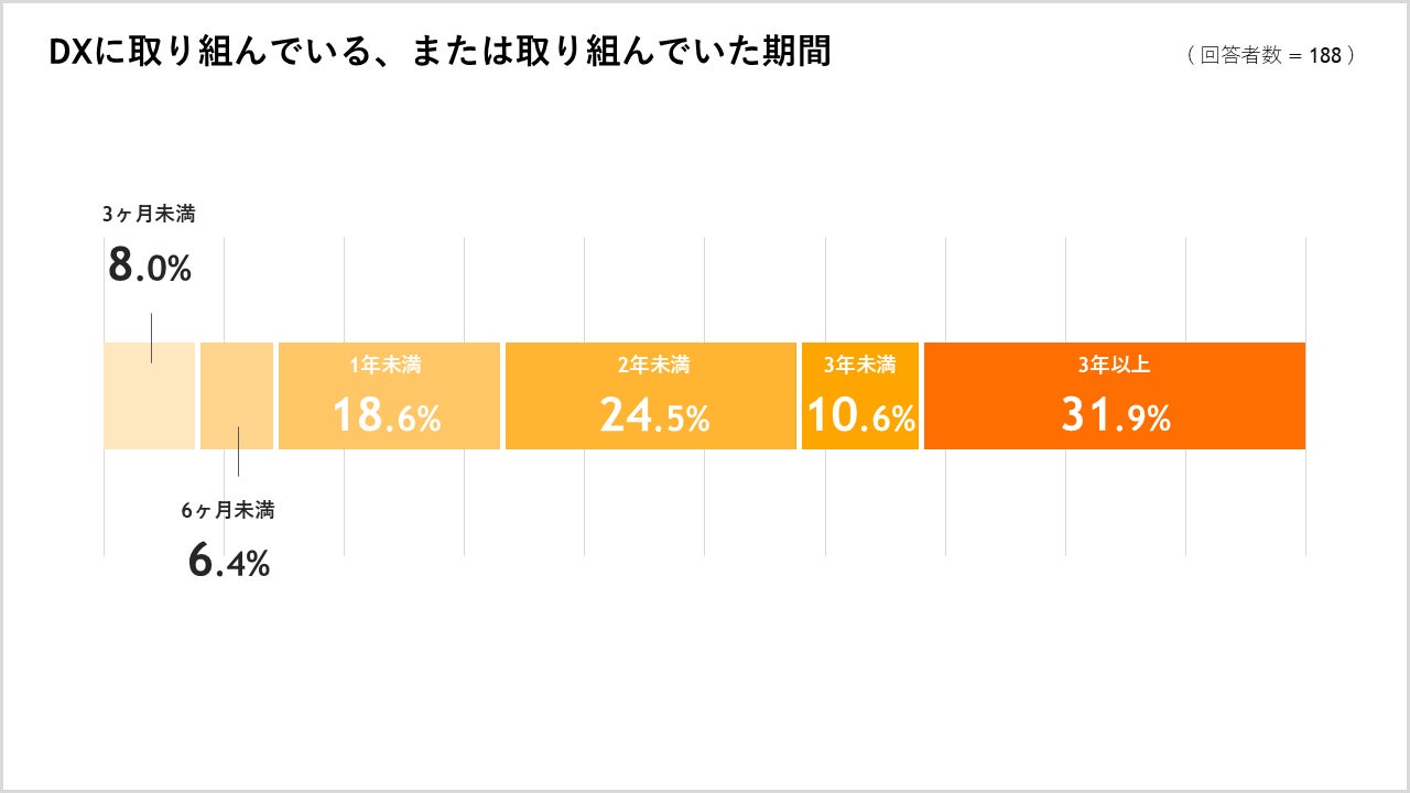 「DXに取り組んでいる(いた)」と回答した方に対して「DXに取り組んでいる(いた)期間をお教えください」という質問に対し、31.9%が「3年以上」と回答しました。「3ヶ月未満」「6ヶ月未満」「1年未満」含む直近1年以内でDXの取り組みを開始した企業は33.0%で、大きく増加したことがわかります。