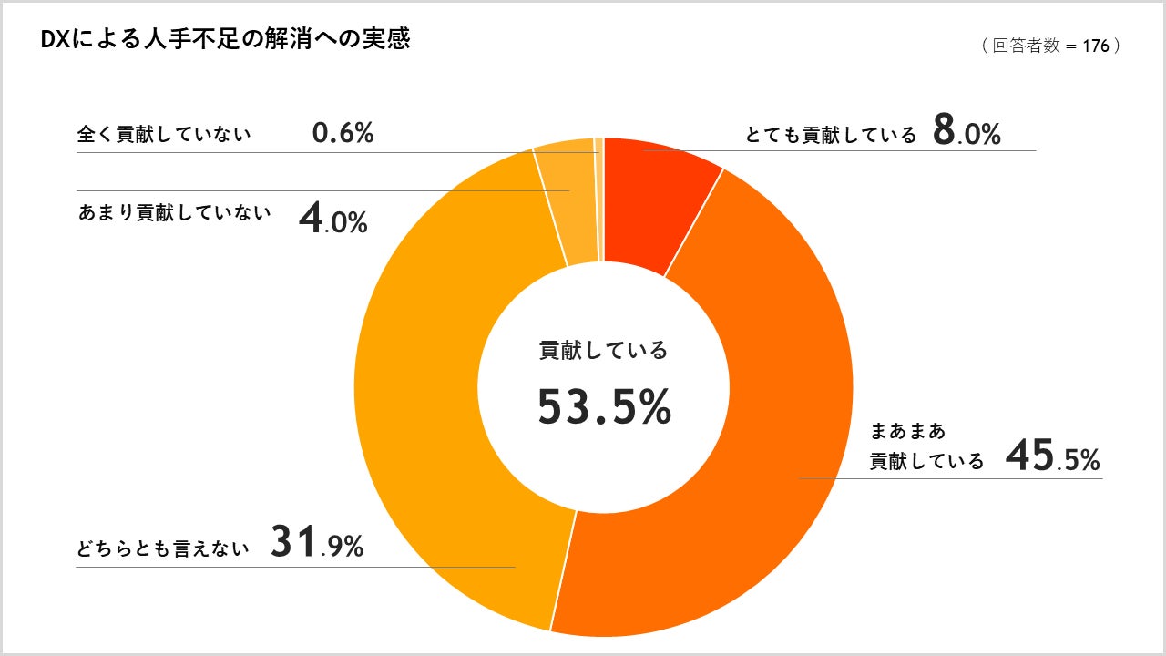 住宅関連業界では人手不足が深刻な問題となる一方で、DX推進によって人手不足の解消を克服しようとする動きが見られ、53.5%の事業者が効果を実感しています。