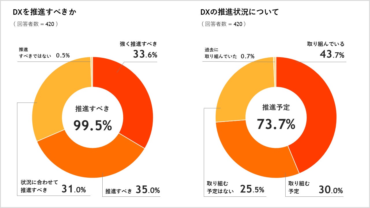 「DX推進すべきだと思う」は99.5%、「DXに実際に取り組んでいる(取り組む予定)」は73.7%
