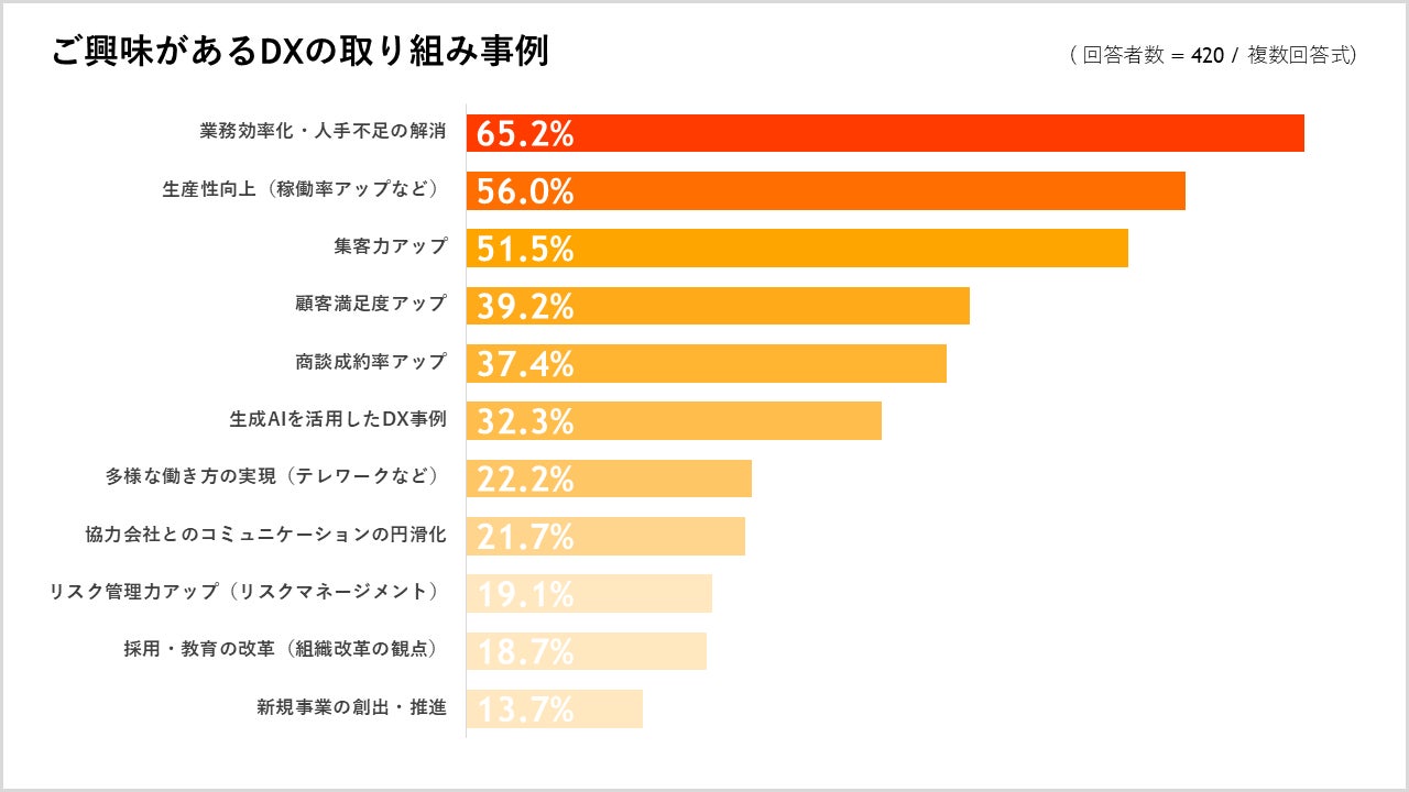 ◆ 興味があるDXの事例は「業務効率化・人手不足の解消」が最多で65.2%、次いで「生産性向上(稼働率アップなど)」が56.0%、「生成AIを活用したDX事例」が32.3%