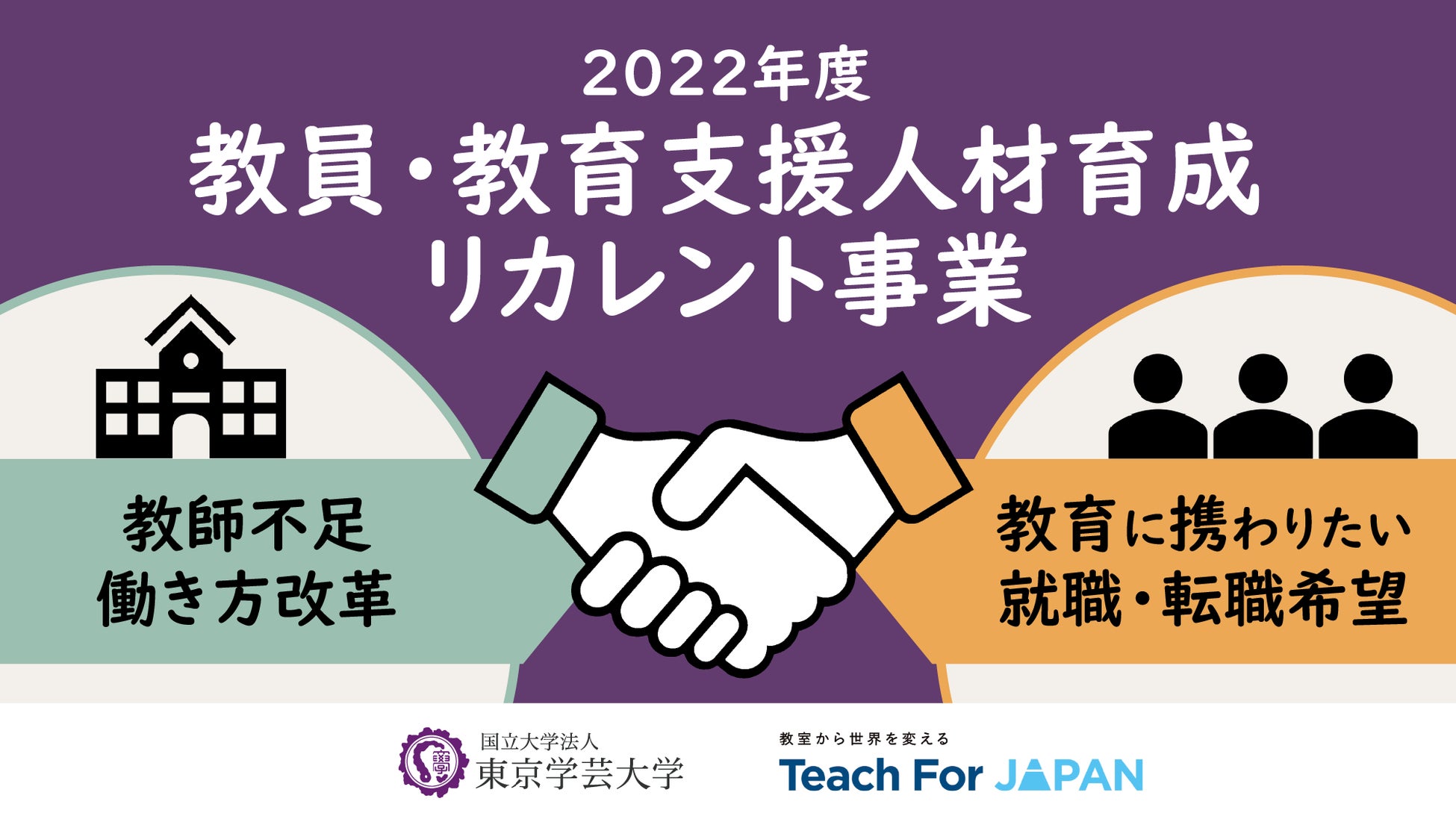 国立大学法人東京学芸大学は、認定NPO法人 Teach for Japanと協働して取り組む、「質の高い社会人から教員へのリカレントプログラム」(令和4年度文部科学省採択「DX等成長分野を中心とした就職・転職支援のためのリカレント教育推進事業」)の募集を開始いたしました。