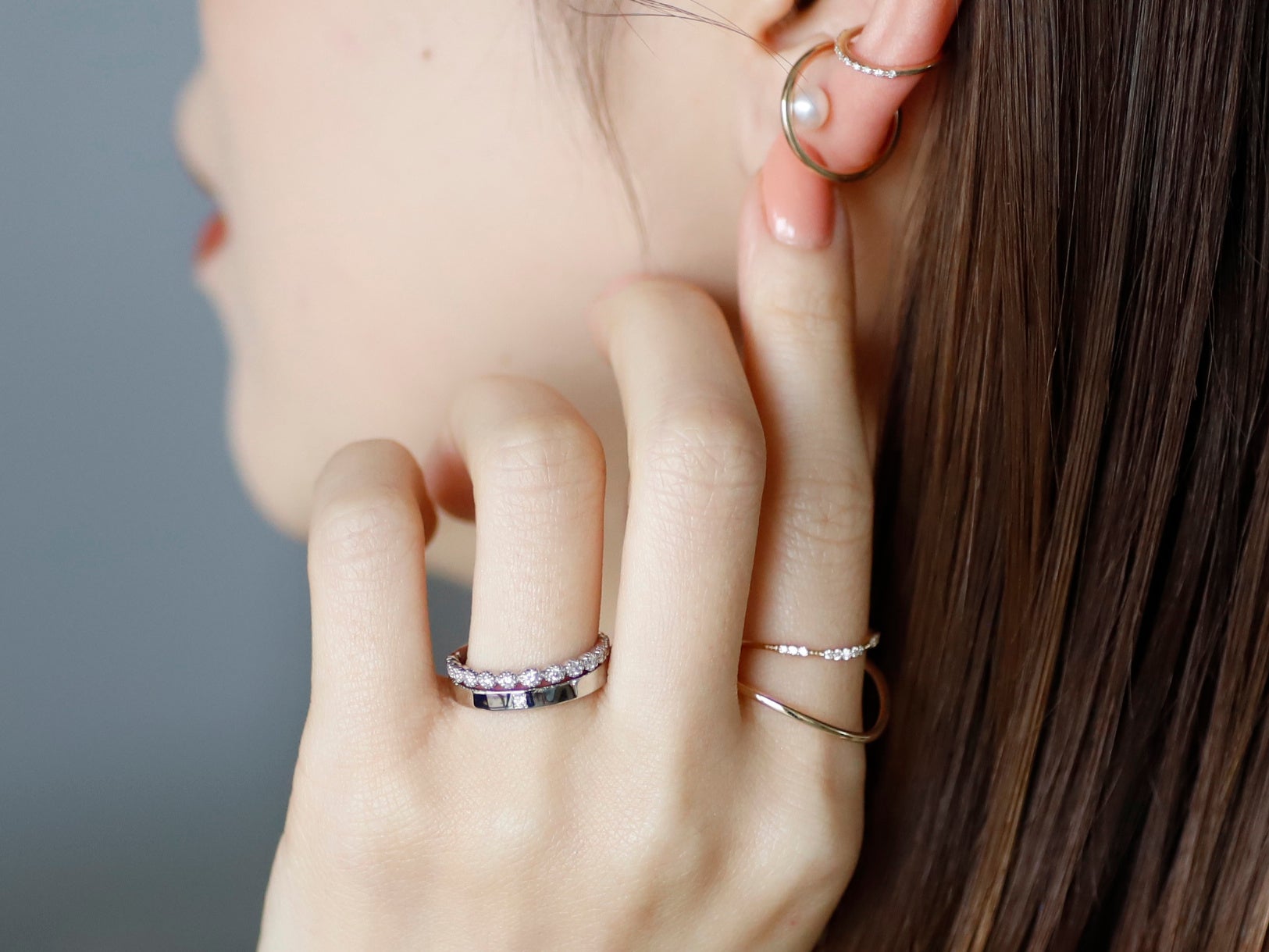 シンプルなデザインのため、様々なリングと重ねづけの相性が良いのも魅力のひとつです。ブライダルリングとの重ねづけはもちろん、ファッションジュエリーとレイヤードしてワンランク上のジュエリーコーデを楽しんでいただけます。
