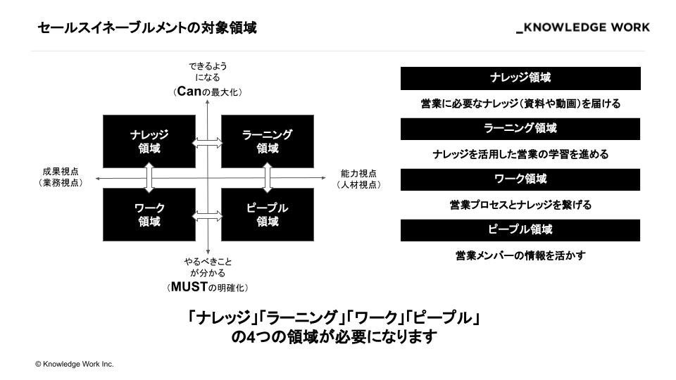 業務における成果・能力の向上にはやるべきことの最大化とできることの最大化が必要です。「ナレッジワーク」では、セールスイメーブルメントに必要な4つの要素を定義しました。具体的には、業務に必要なナレッジを届けるナレッジ領域、業務プロセスとナレッジを繋げるワーク領域、ナレッジを活用した学習を進めるラーニング領域、人のデータを活用して業務を変えるピープル領域になります。