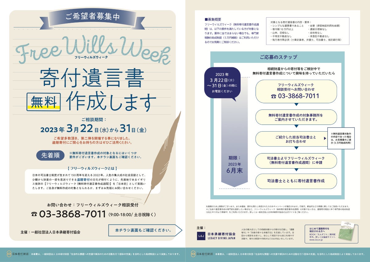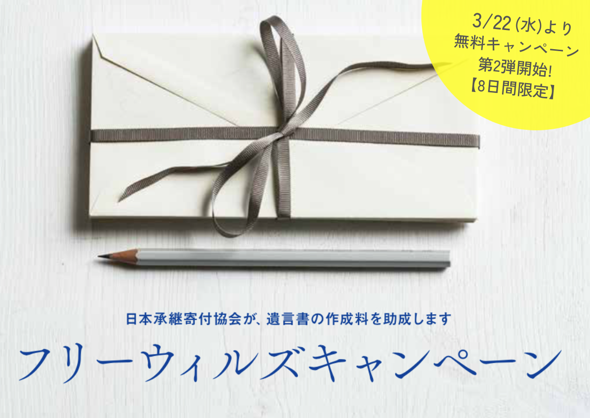 ⼀般社団法⼈⽇本承継寄付協会(所在地:東京都⽂京区、代表理事:三浦美樹)は、⼀般財団法⼈⽇本寄付財団の助成により、「日本初 ※1」の試みとして2022年8月に実施した寄付遺言書の作成助成を行う啓発活動「フリーウィルズキャンペーン(遺贈寄付の専門家報酬助成)」について、ご相談多数につき、第2弾:2023年3月22日(水)〜31日(金)を相談受付期間として開催致します。