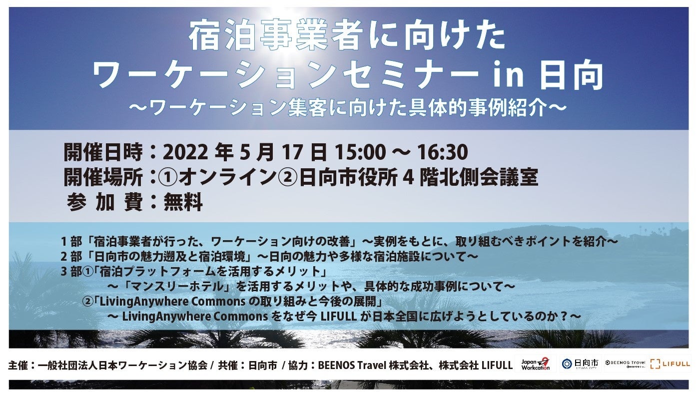 一般社団法人日本ワーケーション協会では、5月17日15:00より、ホテルなどの宿泊事業者に向けたワーケーションセミナーを実施します。
