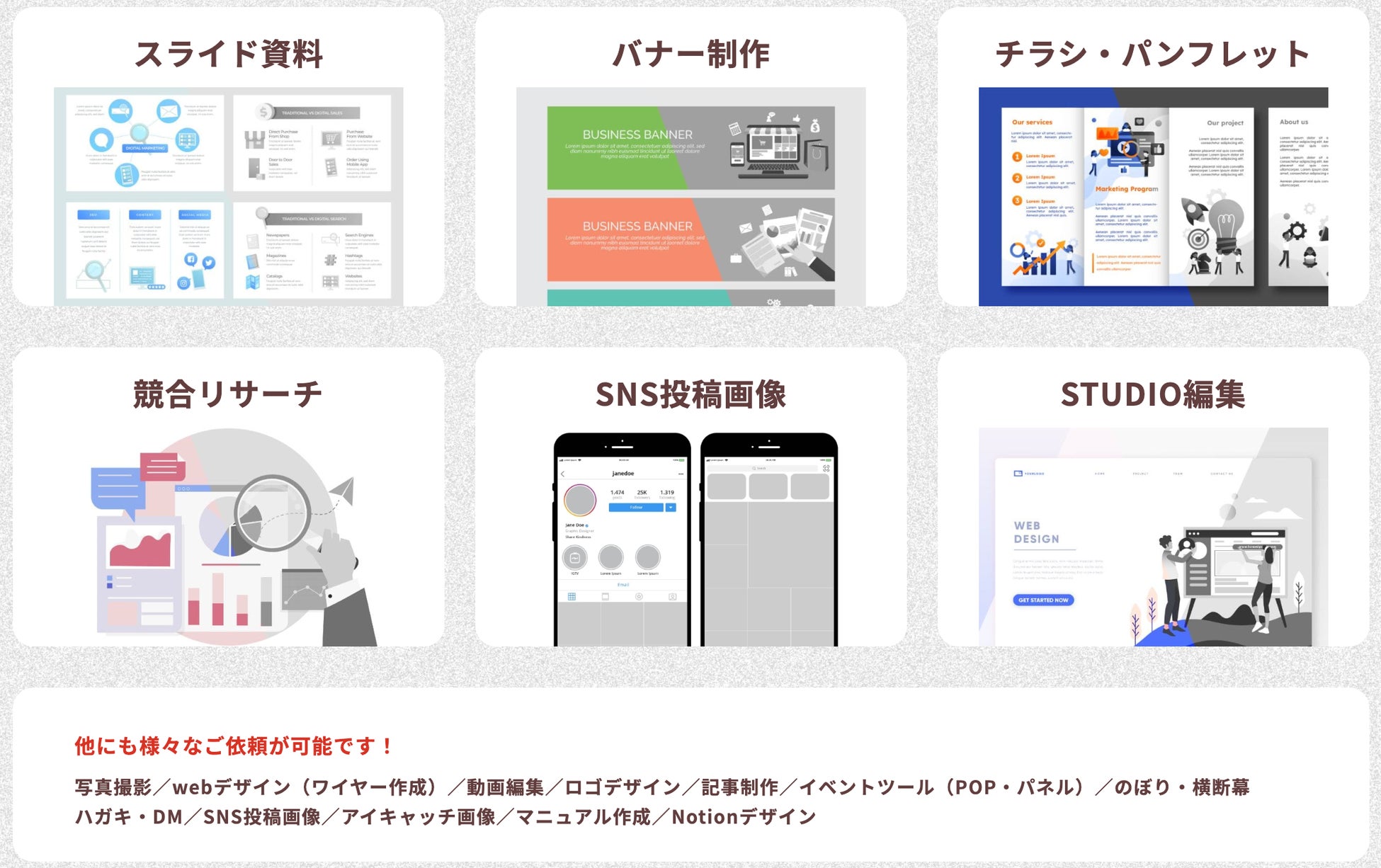 依頼された内容に応じて最適なデザイナーをアサインし、資料・LP・バナー・紙媒体など幅広いコンテンツ制作に対応できます。社内デザイナーのような感覚で、手軽にサクっとデザイン業務をお任せいただけます。