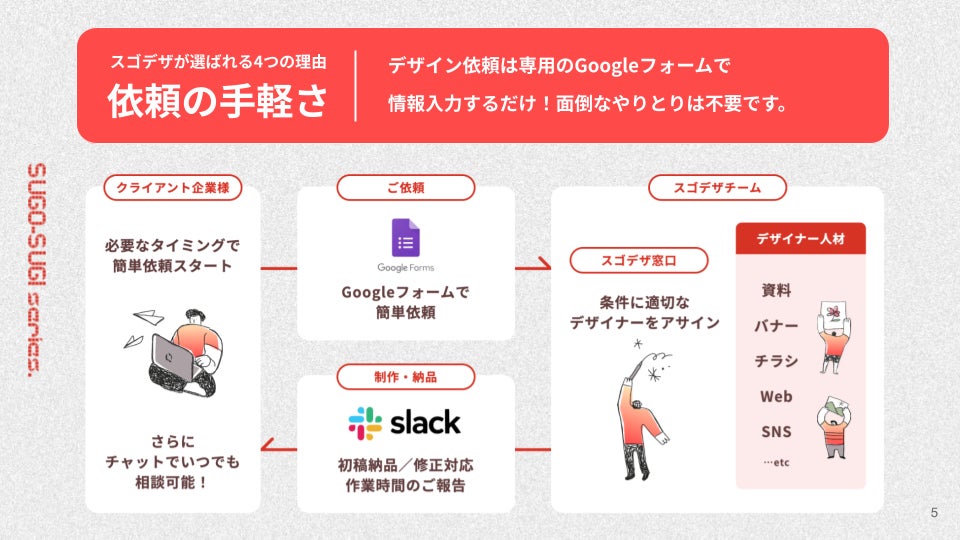 スゴデザは、必要なときに専用フォームからサクッと依頼できます。依頼後は、チャットツールを通じて手間なくコミュニケーションが可能です。