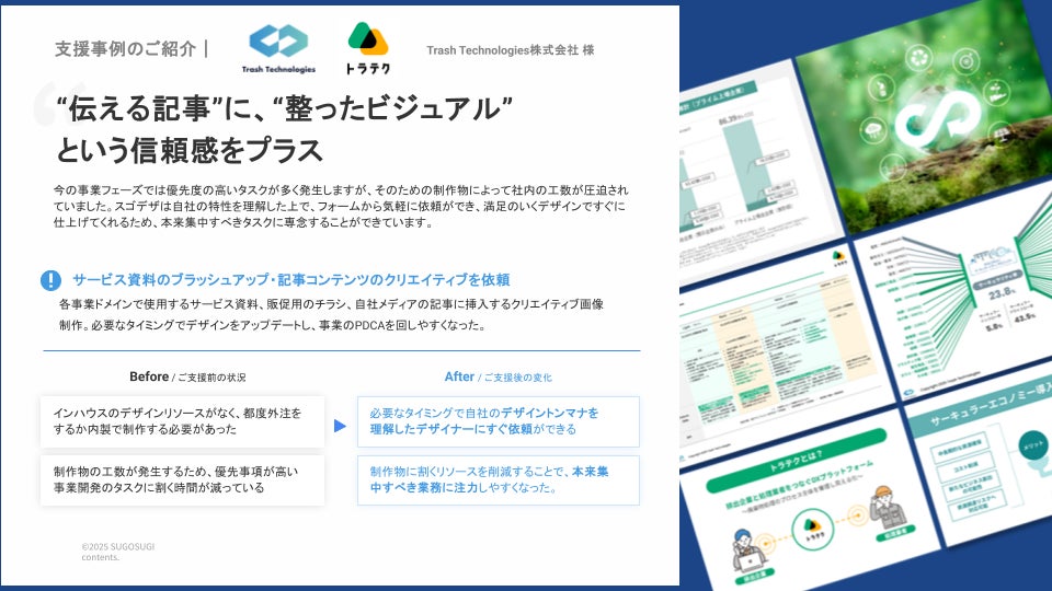 「スゴデザ」は、資料・LP・バナー・SNS投稿などの「ちょっとしたデザイン」を、必要なときにサクッと整えるデザインBPOサービスです。コミュニケーションコストを大幅に抑え、まるで社内デザイナーのように手軽に、高品質なアウトプットを提供します。