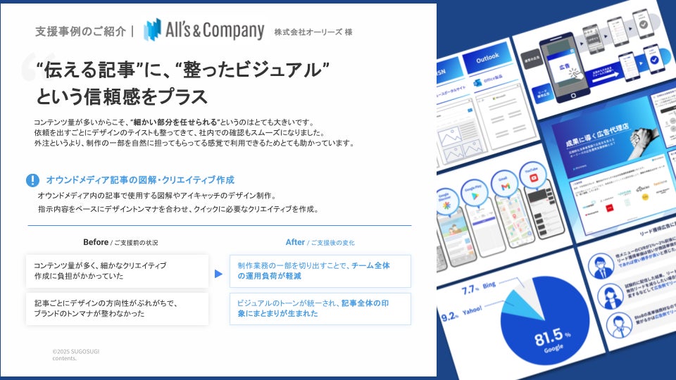 スライド資料、バナー、紙媒体などスゴデザでは幅広いデザイン業務に対応しています。そのほか、制作するコンテンツの調査業務や事務作業など、BPO業務も対応可能です。その他の業務についてもお気軽にご相談ください。